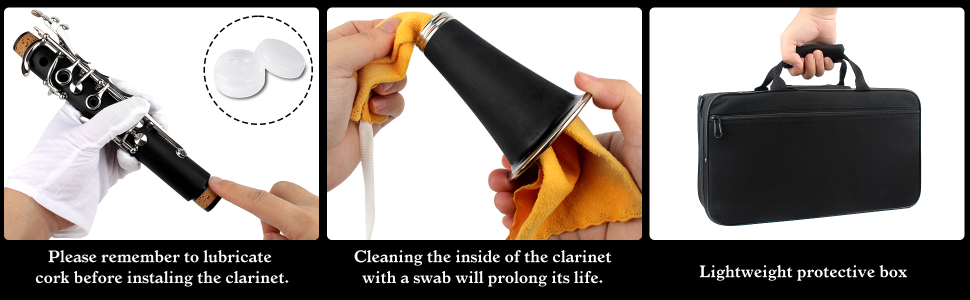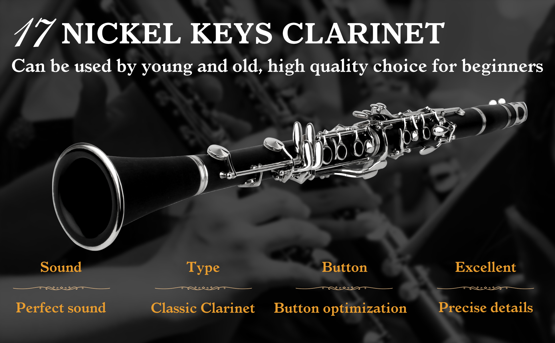 حرفية فائقة -- يبذل فريق من الفنيين المخضرمين لمدة 20 عامًا قصارى جهدهم لإنشاء كلارينيت للطلاب مناسب للمبتدئين. جميع المفاتيح مصنوعة من مفاتيح متموجة بالكامل، وعملية المعالجة مزدوجة الطبقات أكثر كثافة واستقرارًا لضمان شعور مريح باللعب.