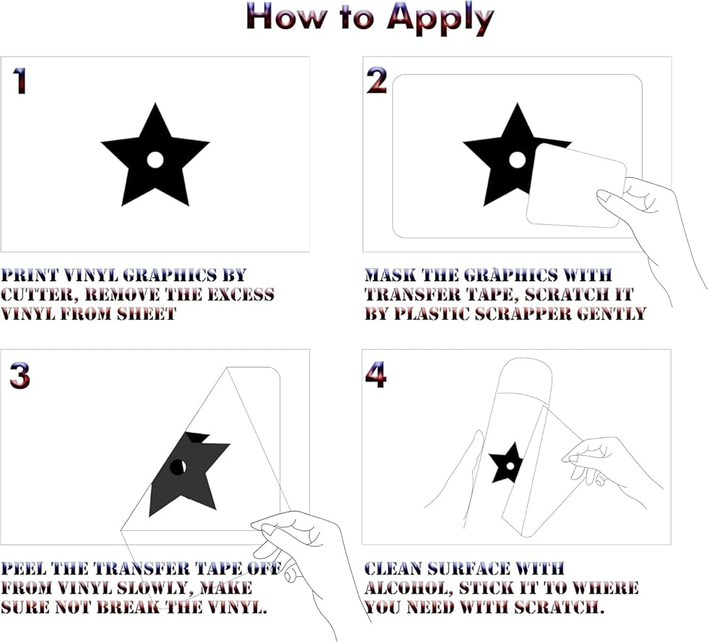 HOW TO USE: Cover up the printed vinyl with transfer tape, press the surface of tape gently with plastic scrapper; after cleaning object in preparation for transfer, wipe it down with alcohol; get the vinyl off it's backing and onto the transfer tape by peeling it straight back; be ready for the vinyl to stick immediately onto object, scrape the pattern area back and forth and then release the transfer tape slowly from one corner. You will have a professional job and perfection transfer.