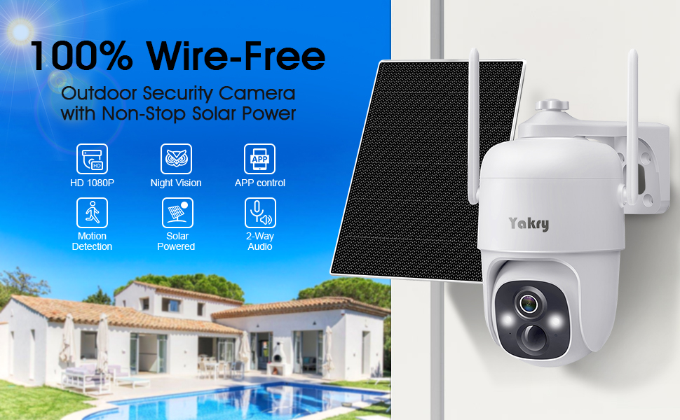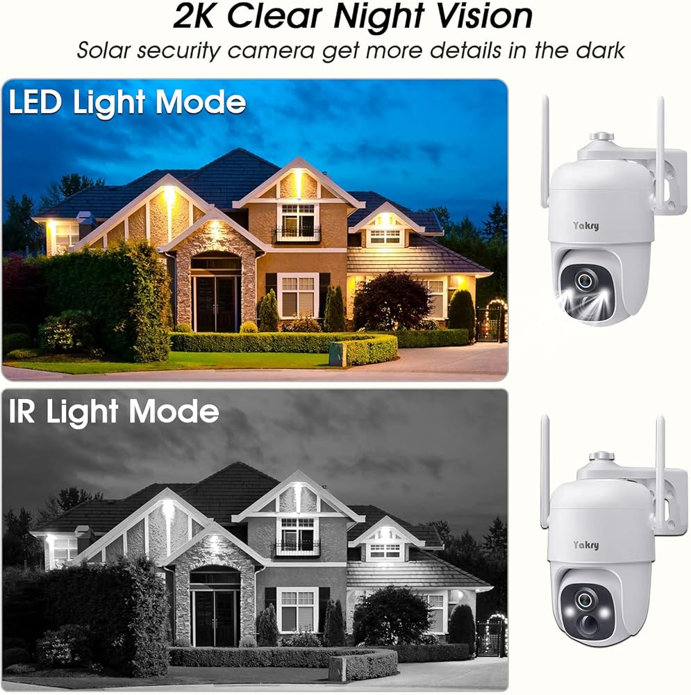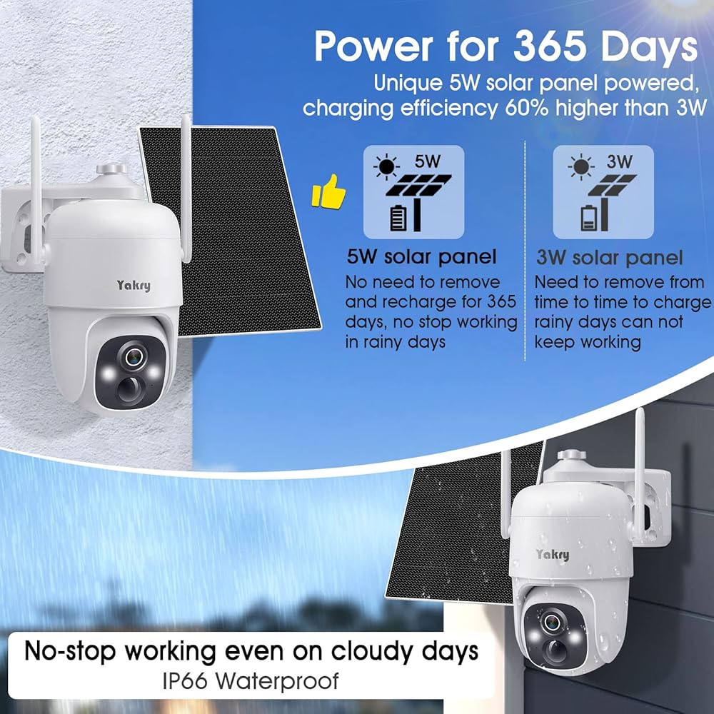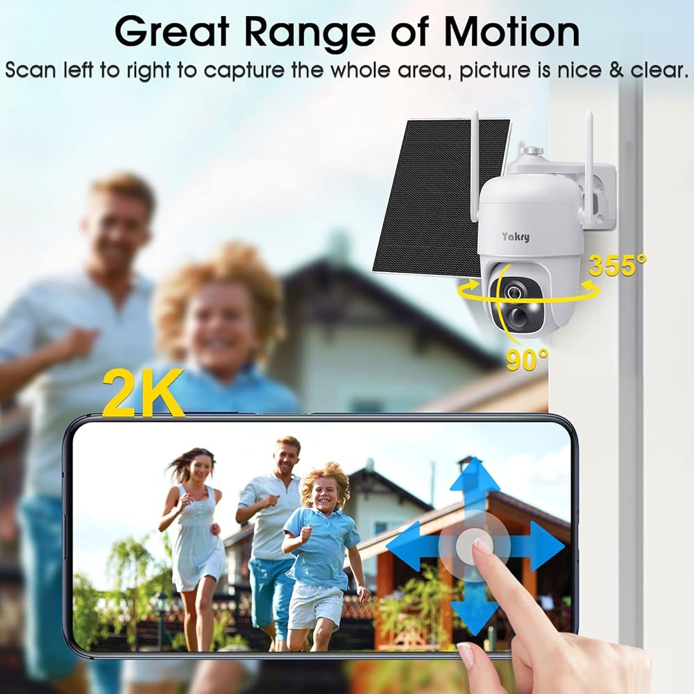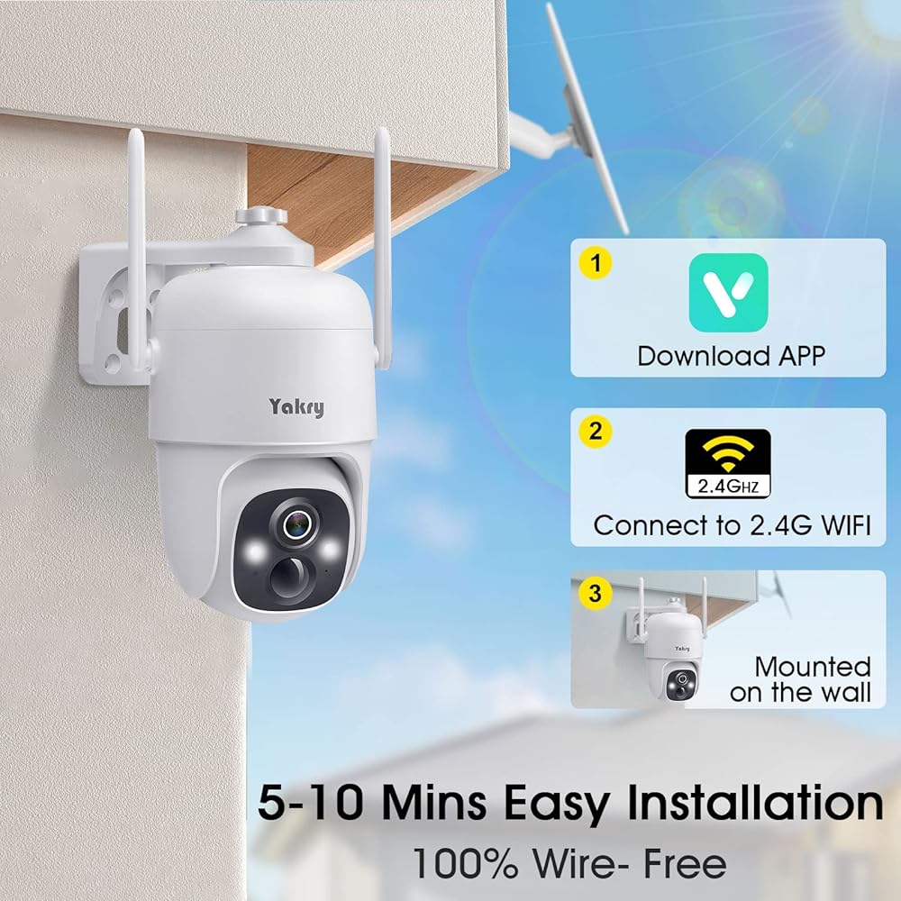 كاميرات مراقبة Yakry لاسلكية تعمل بالطاقة الشمسية في الهواء الطلق - واي فاي 2K ثنائي الاتجاه صوت منزلي ذكي كاميرا خارجية مع لوحة شمسية ملونة 5 وات رؤية ليلية وكاميرا خارجية تعمل بالبطارية وكشف الحركة