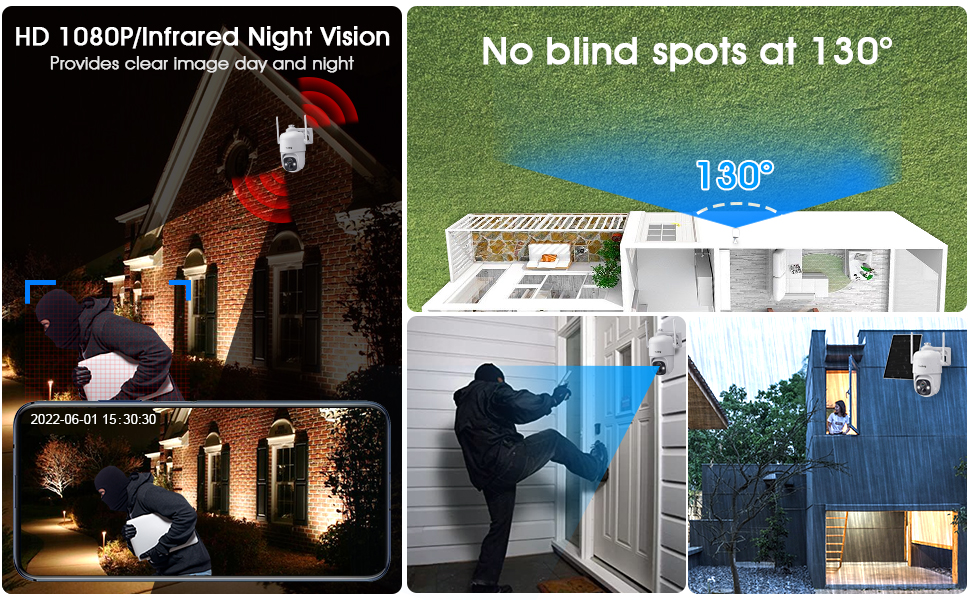 • تغطية رؤية واسعة 355 درجة ومقاومة للماء IP66: يتحكم التطبيق في الكاميرا الخارجية بزاوية 355 درجة وإمالة 120 درجة، من جميع النواحي لمراقبة المنطقة العمياء وأي زاوية لتحقيق أقصى قدر من السلامة الشخصية والممتلكات الخاصة بك. إن امتلاكها يشبه امتلاك زوج من العيون ذات التقنية العالية. تتوافق كاميرا الأمان الشمسية بشكل صارم مع المعايير الدولية لمقاومة الماء، ويمكن أن تعمل بشكل جيد ليس فقط في الأيام المشمسة والممطرة، ولكن أيضًا في الأحوال الجوية السيئة.