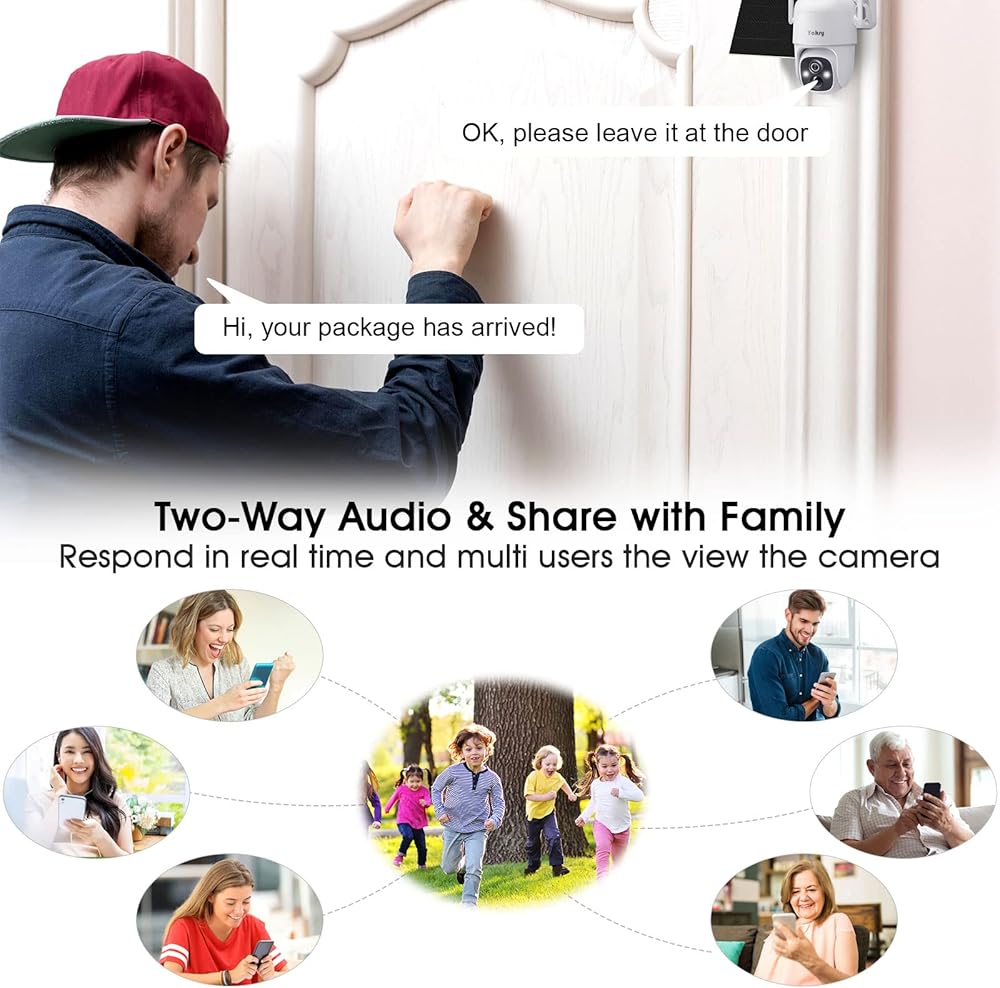 • مشاركة الصوت والعائلة في اتجاهين: احصل على كاميرات الأمان الخارجية هذه، أو التحدث مع البريد السريع أو اطلب من الأطفال تناول الطعام باستخدام الميكروفون المدمج ومكبر الصوت عن بعد تجربة رائعة. تسمح كاميرات الأمان التي تعمل بالطاقة الشمسية لحسابات متعددة بالعرض في الوقت الفعلي ومشاركة مقاطع الفيديو مع العائلة في أي وقت وفي أي مكان والتقاط اللحظات السعيدة معًا.