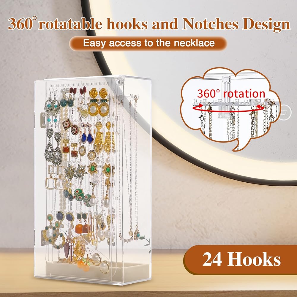 منظم حامل القلادة، حامل عرض القلادة، صندوق القلادة، حامل المجوهرات المنظم، منظم المجوهرات الشفاف من الأكريليك، عرض القلادة، علبة عرض المجوهرات، دوران مع 24 خطافًا