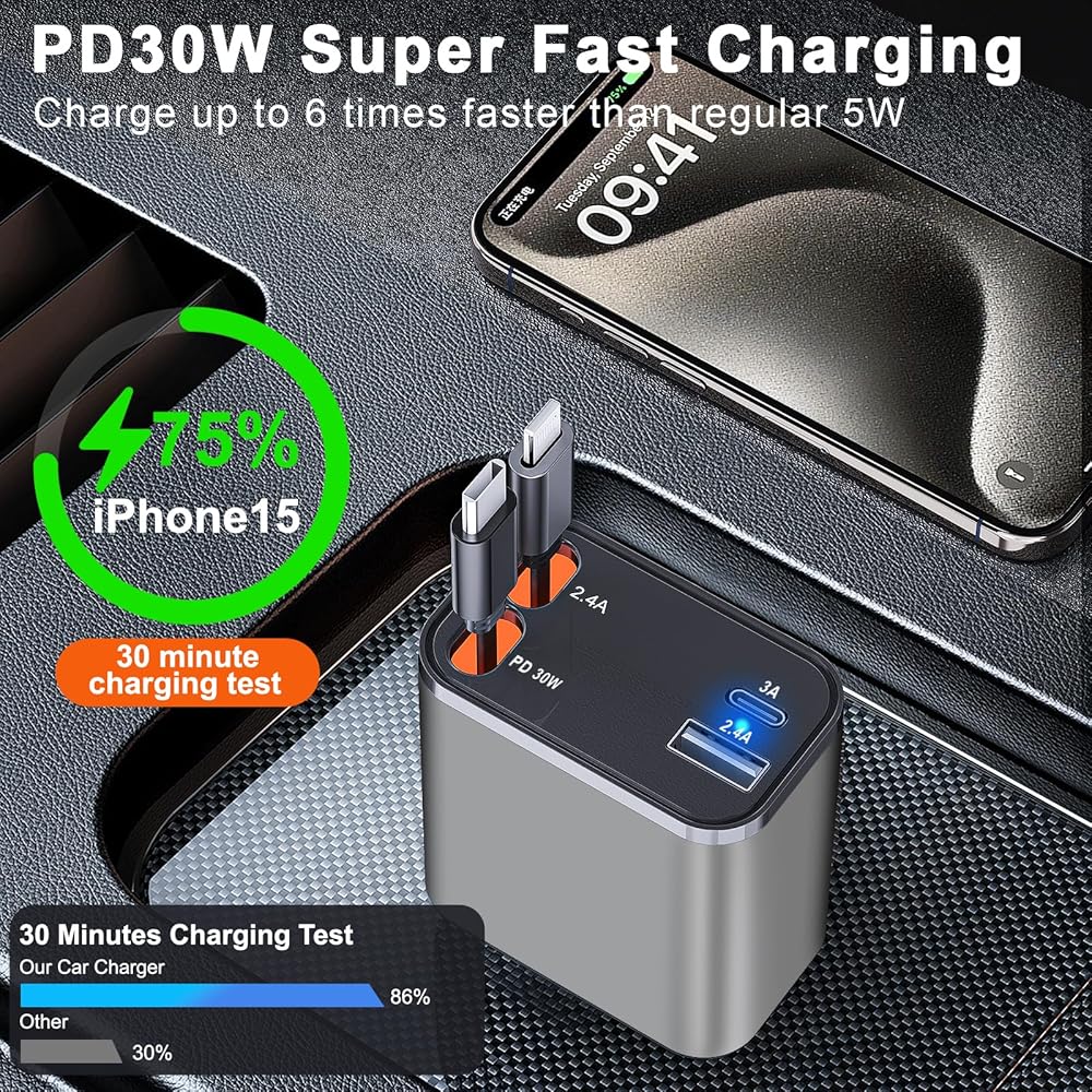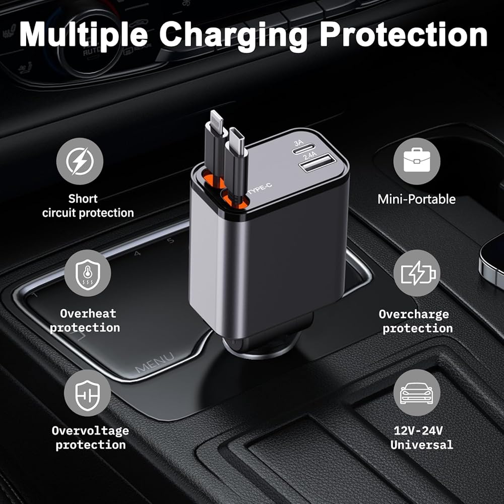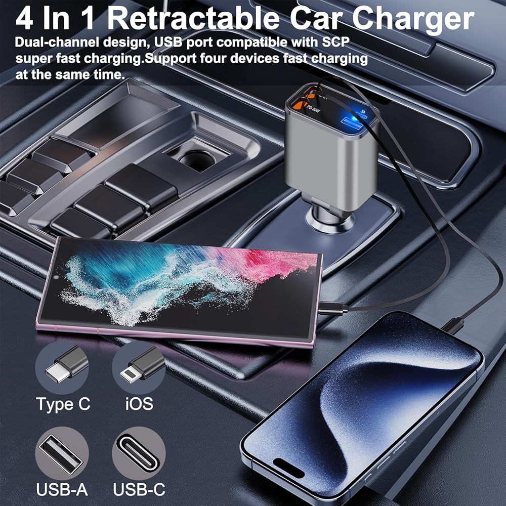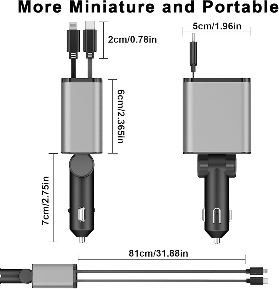 شاحن سيارة قابل للسحب من Paiholy، شاحن سيارة صغير فائق السرعة 4 في 1 مع كابلات مزدوجة قابلة للسحب ومنفذي USB، شاحن سيارة صغير الحجم متوافق مع iPhone 15/14/13 Pro Max/Samsung/Pixel