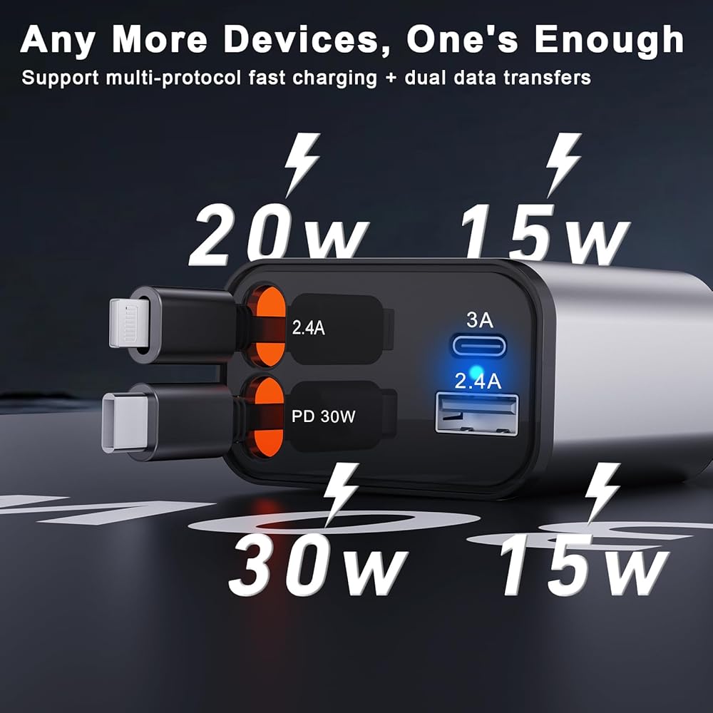 شاحن سيارة للهاتف قابل للسحب 4 في 1: الحجم الصغير لشاحن السيارة القابل للسحب 4 في 1 يضمن أنه يشغل الحد الأدنى من المساحة في سيارتك. اشحن ما يصل إلى أربعة أجهزة في وقت واحد وادعم ضبط زاوية الجسم بمرونة. يتميز شاحن سيارة الهاتف القابل للسحب بتصميم كابل قابل للسحب مبتكر خالٍ من التشابك والذي يحافظ على تنظيم كابلات الشحن الخاصة بك وجاهزة للاستخدام. يمكن سحب الكابل القابل للسحب حتى 80 سم تقريبًا ويمكن سحبه تلقائيًا عند عدم استخدامه.