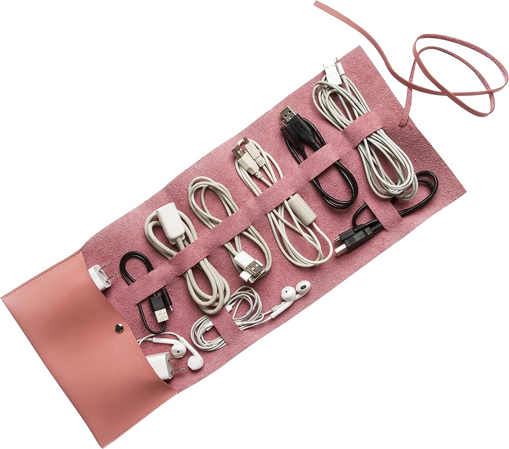 The cord roll holds up to 8 cords, 2 plugs, and small knick knacks. A simple way to organize and stow your cords, plugs, and smaller gear. This newly updated design includes a button enclosure pocket to lock in your smaller gear. With an exterior strap that simplifies the form and provides a handsome look to keep your cords organized.