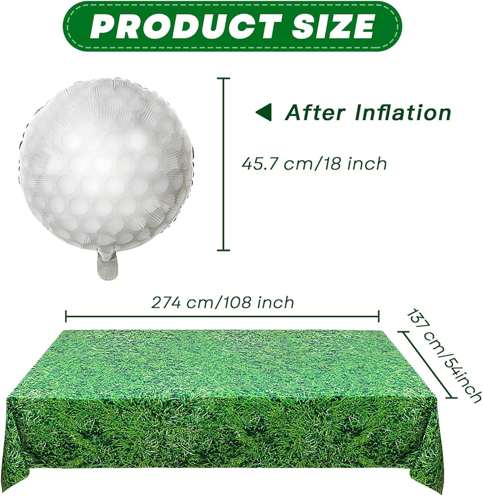 Proper sizes: each green grass golf tablecloth is approx. 274 x 137 cm/ 108 x 54 inch (L x W), which is enough to cover a rectangular table up to 8 feet, each golf ball balloons is 18 inch, big enough to draw attention of others and add charms to various decorations
