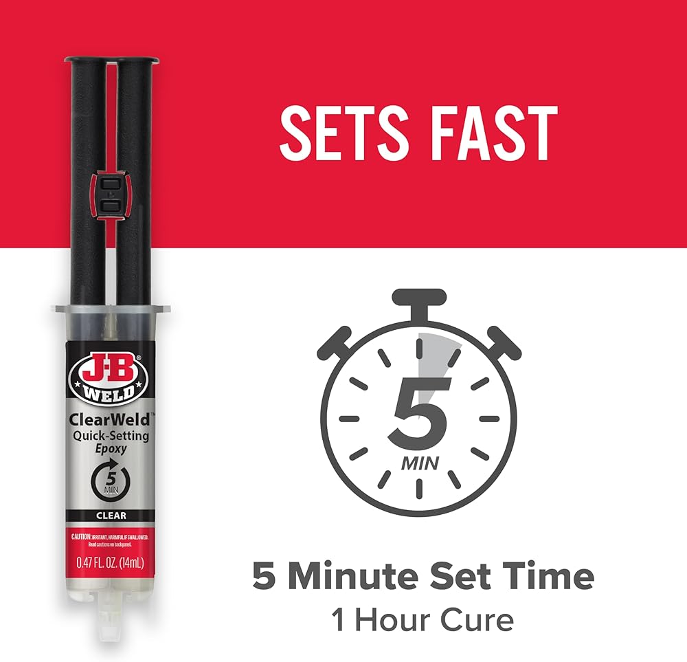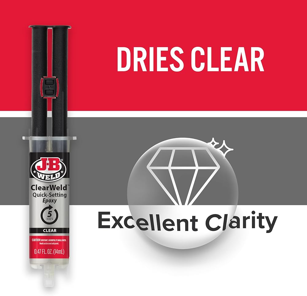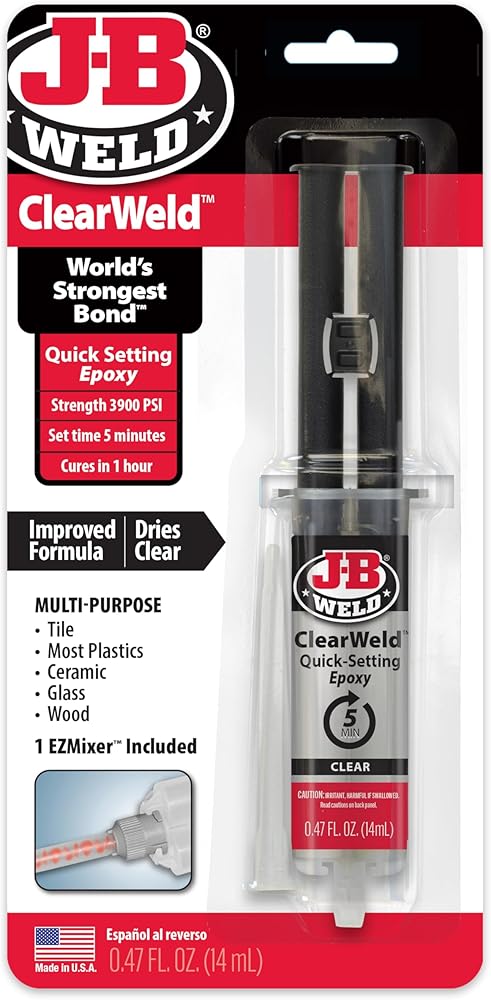 • J-B Weld ClearWeld: A clear, quick setting and multipurpose two part epoxy that provides a strong and lasting bond on surfaces including metal, tile, most plastics, ceramic, glass, wood and more. J-B Weld ClearWeld comes in a syringe allowing for an easy 1:1 mix ratio. The unique syringe has a re-sealable cap that prevents drying out and leaking, allowing for multiple uses!