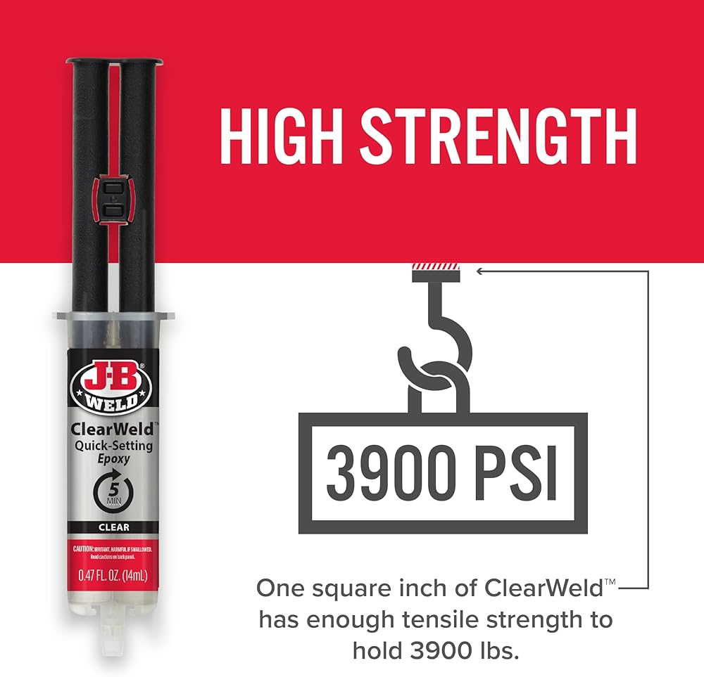• Strength: J-B Weld ClearWeld has tensile strength of 3900 PSI.