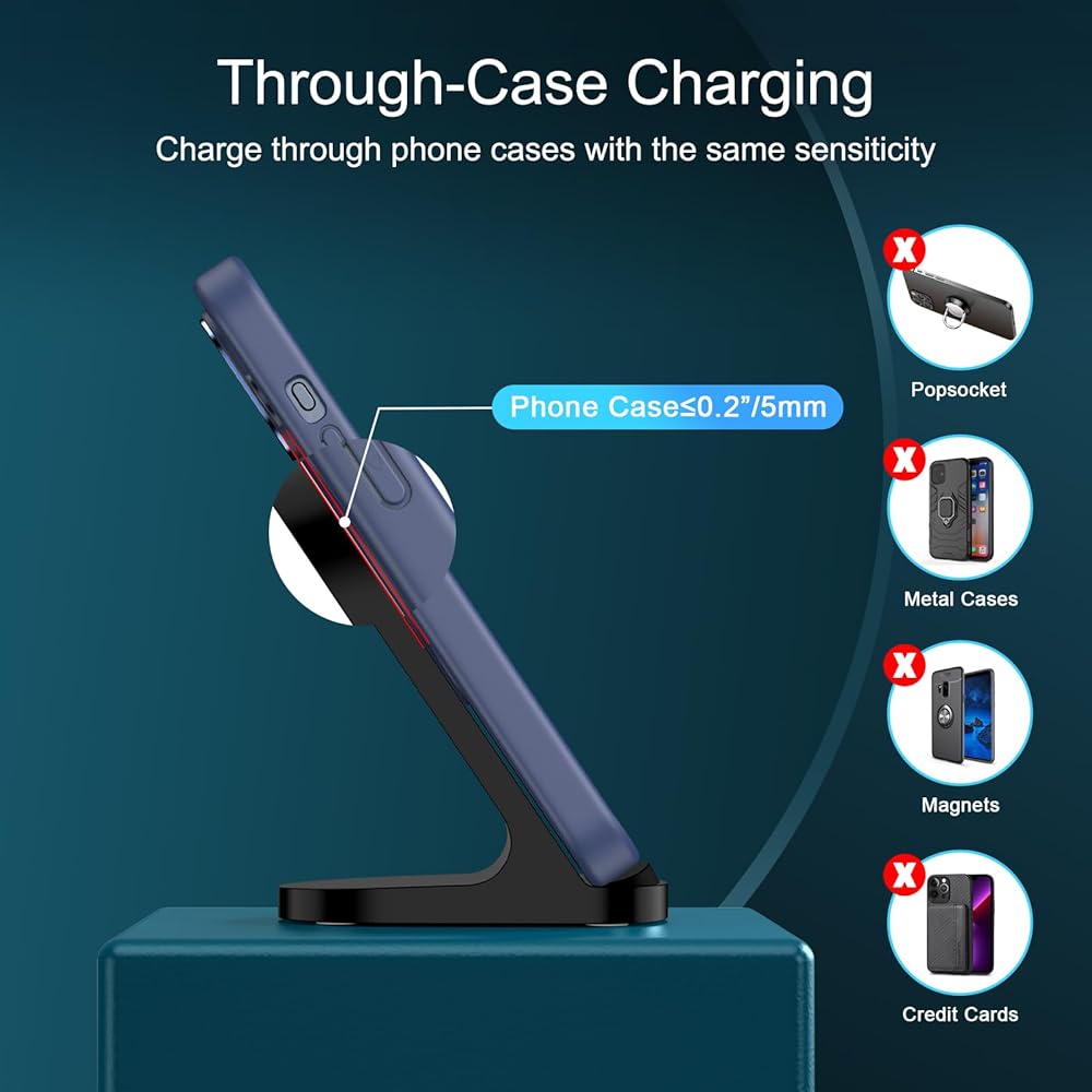 ✔Case-Friendly Up to 5mm: Wireless charger can charge through protective cases that are less than 5mm thick.