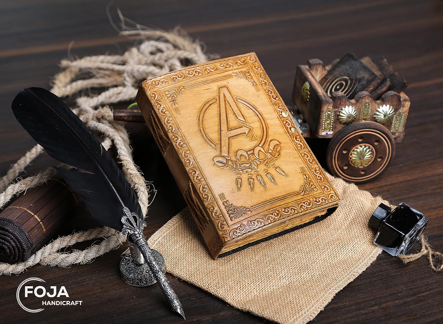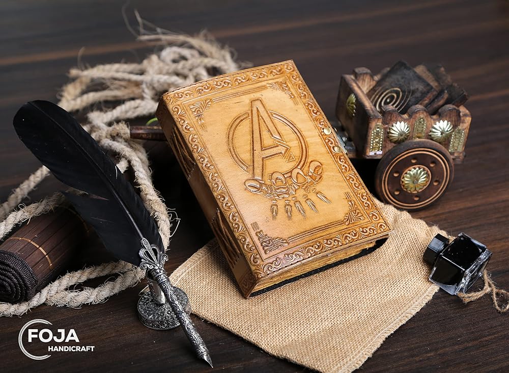 مجلة جلدية كلاسيكية منقوشة بشعار Avengers Marvels للرجال والنساء 200 صفحة من الورق العتيق المصنوع يدويًا بحافة سطح السفينة، دفتر رسم جلدي، مجلة رسم، مجلة جلدية مطبوعة هدية رائعة