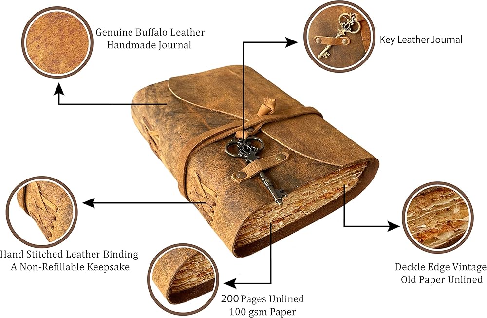 ✔️ جلد أصلي متين: - هذه المجلة العتيقة للنساء والرجال (5x7 بوصات و200 صفحة) مصنوعة من أجود أنواع الجلد البني المحبب، وهي ناعمة ومريحة جدًا في اليدين. إنه حارس خاص لأحلامك وتصميماتك وأفكارك.