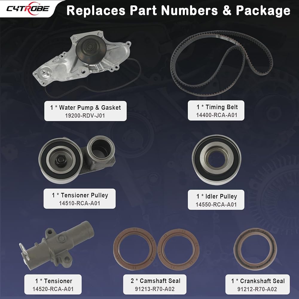 • 🚗【Replaces Parts Numbers】Timing Belt Kit: TKH-002, TCKWP329; Water Pump with Gasket: 19200-RDV-J01; Timing Belt: 14400-RCA-A01; Tensioner Roller / Tensioner Pulley: 14510-RCA-A01; Idler Roller / Idler Pulley: 14550-RCA-A01; Hydraulic Tensioner: 14520-RCA-A01; Crankshaft Seal:91212-R70-A02, 91212-5MR-A01; Camshaft Seals: 91213-R70-A02.