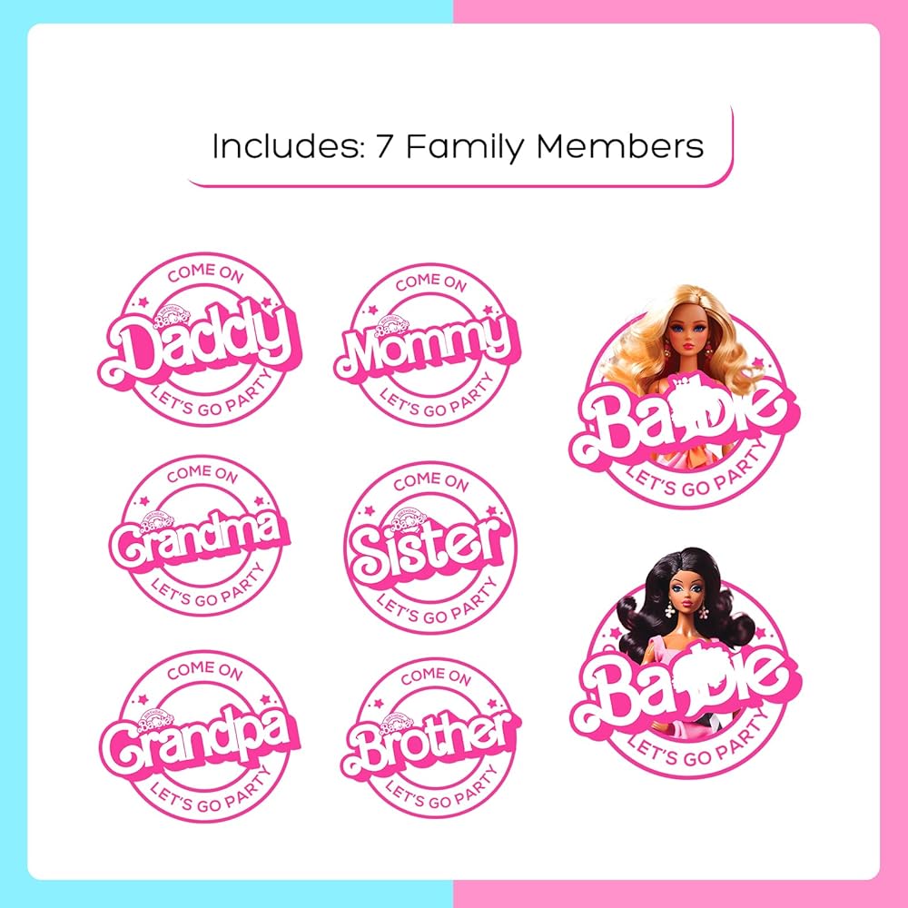 ► 7 MEMBERS PACK : Designs for 7, including family titles, birthday and various party squad elements of different sizes for mix & match. Each measure 6" - 8" wide respectively for adults and kids.