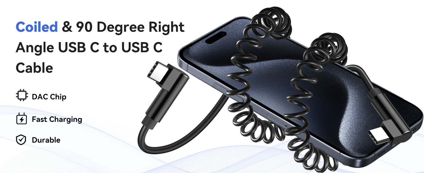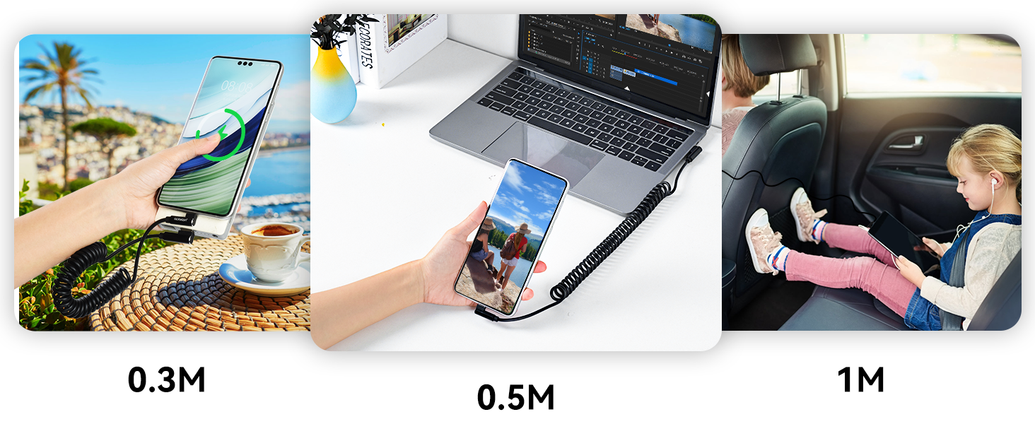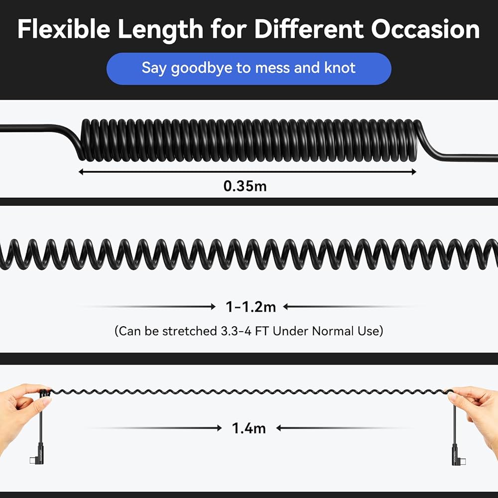 • 【كابل USB C ملفوف مرن】: تم تصميم كابل USB C ملفوف قابل للسحب بشكل زنبركي، والذي يمكن تمديده بحرية لتجنب مشكلة الربط. يمكنك ضبط الطول (0.3-1.5 م) حسب الحاجة.