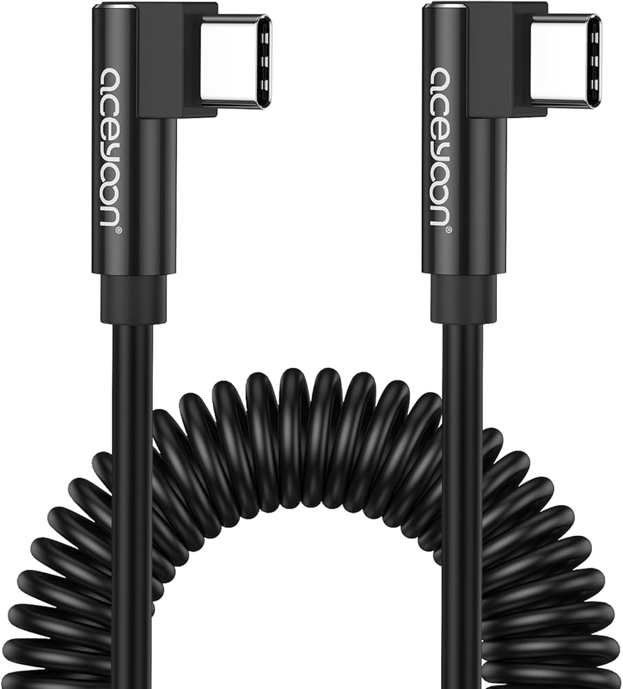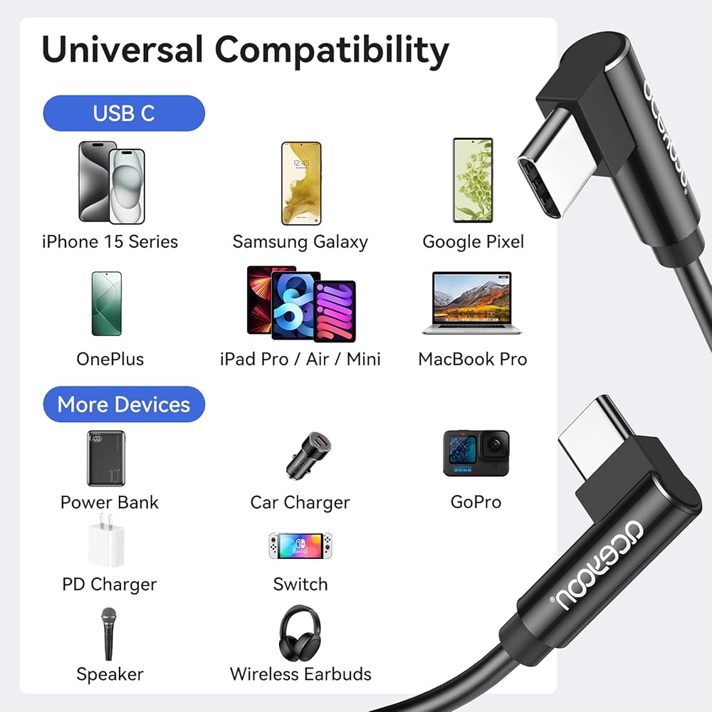 • 【توافق واسع】: كابل usb c الحلزوني إلى usb c هذا مناسب لمعظم الأجهزة ذات منافذ USB C القياسية. كابل USB من النوع C 90 درجة متوافق مع iPhone 15/15 Plus/15 Pro/15 Pro Max، MacBook Air/Pro، iPad Mini/Pro/Air، Galaxy S23 Ultra/S23+/S23/S22+/S22/Note 20، Google بكسل وهواوي P30/P30 Pro/P40/P40 Pro وما إلى ذلك.