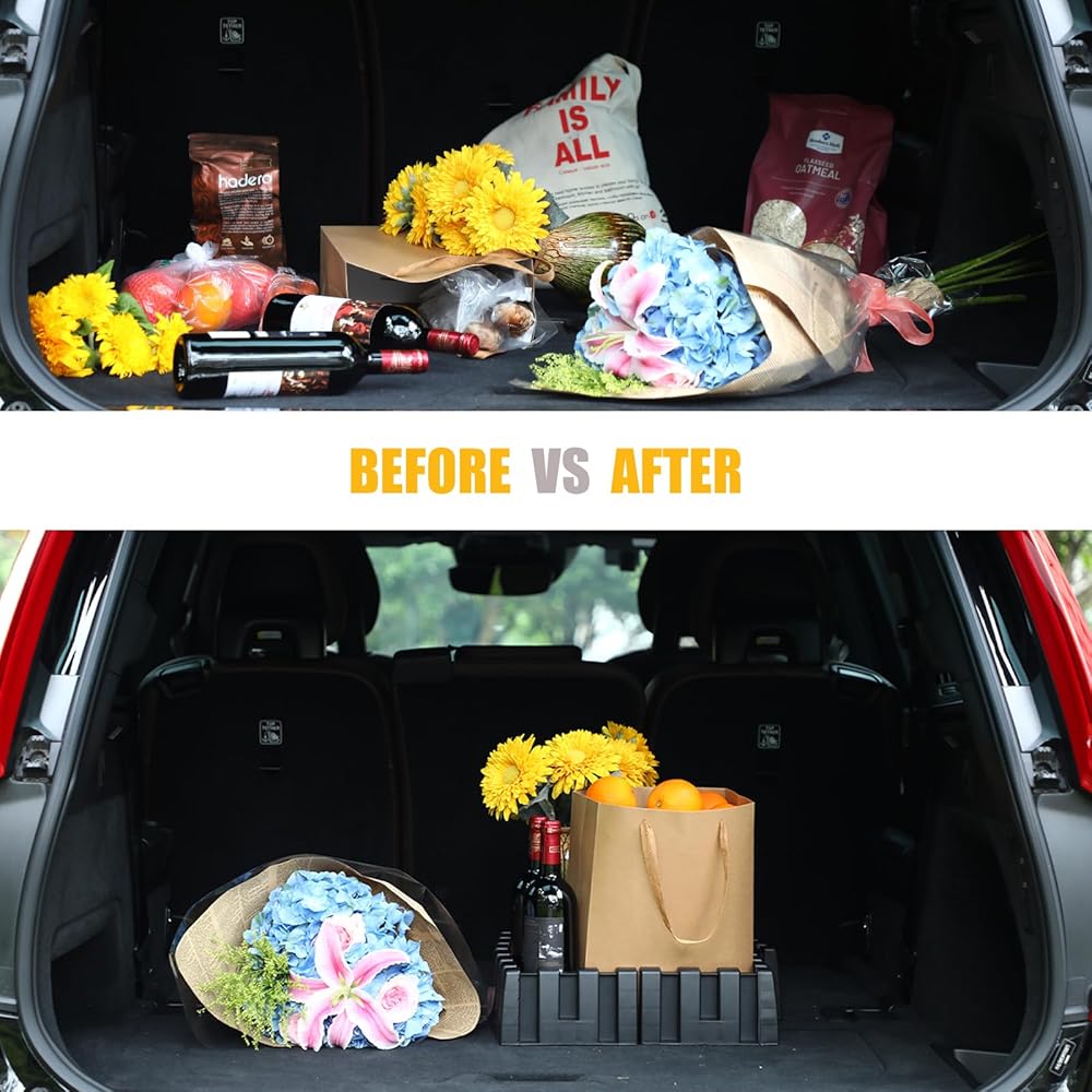 صندوق السيارة الخالي من الفوضى: قم بتحويل صندوق السيارة أو السيارة الرياضية متعددة الاستخدامات إلى مساحة خالية من الفوضى مع ملحقات حامل منظم صندوق السيارة الفاخرة، المصممة للحفاظ على البضائع مرتبة بشكل أنيق ويمكن الوصول إليها بسهولة في منطقة التخزين الخلفية أثناء التنقل.