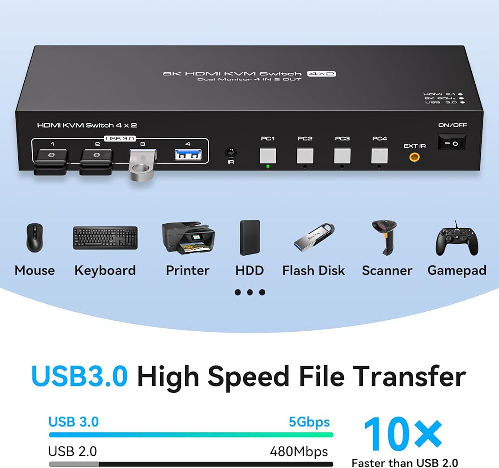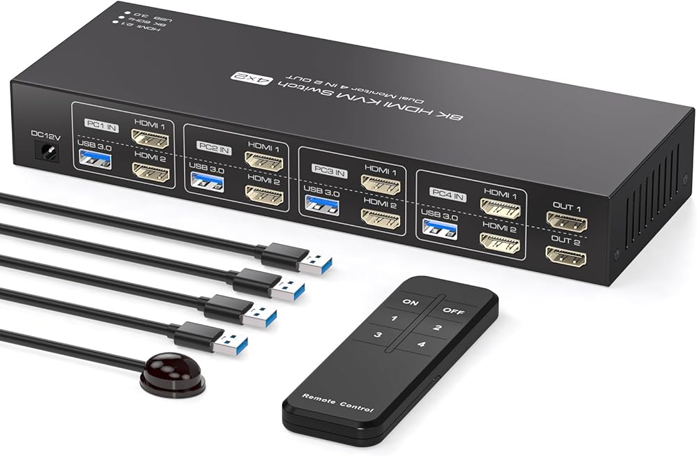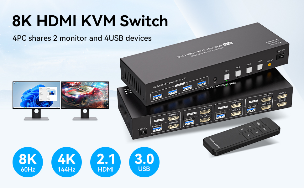 KVM Switch 2 شاشات 4 أجهزة كمبيوتر 8K @ 60 هرتز 4K @ 120 هرتز HDMI KVM Switches شاشة مزدوجة لمشاركة 4 أجهزة كمبيوتر، شاشتين و4 أجهزة USB3.0 مع أربعة كابلات USB3.0 وجهاز تحكم عن بعد بالأشعة تحت الحمراء