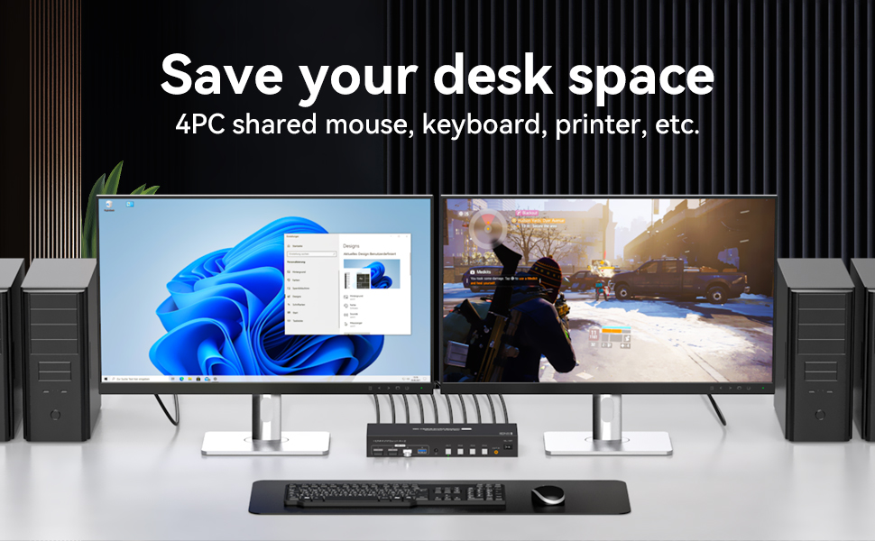 【وضعان للتبديل】 يوفر مفتاح kvm للشاشة المزدوجة وضعين للتبديل: 1. تبديل التحكم عن بعد: التبديل بسهولة بين أجهزة الكمبيوتر المختلفة باستخدام جهاز التحكم عن بعد. 2. تبديل الأزرار: ما عليك سوى الضغط على الأزرار البيضاء لجهاز PC1 إلى PC4 للتبديل بين أجهزة الكمبيوتر. ملحوظة: تبديل مفتاح التشغيل السريع غير مدعوم.