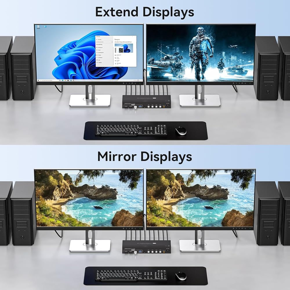 【دقة فائقة الوضوح 8K@60 هرتز】تدعم الشاشة المزدوجة بمفتاح kvm دقة تصل إلى 8K@60 هرتز، مما يوفر شاشة واقعية ونابضة بالحياة حقًا. كما أنه متوافق مع دقة 4K@60 هرتز، و1080P@60 هرتز، و720P@60 هرتز. ملحوظة: لتحقيق أعلى دقة، يرجى التأكد من أن مصدر الإشارة وكابل HDMI والعرض يدعم 8K@60 هرتز.