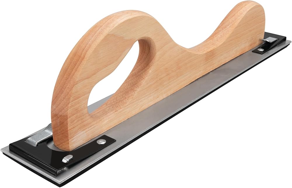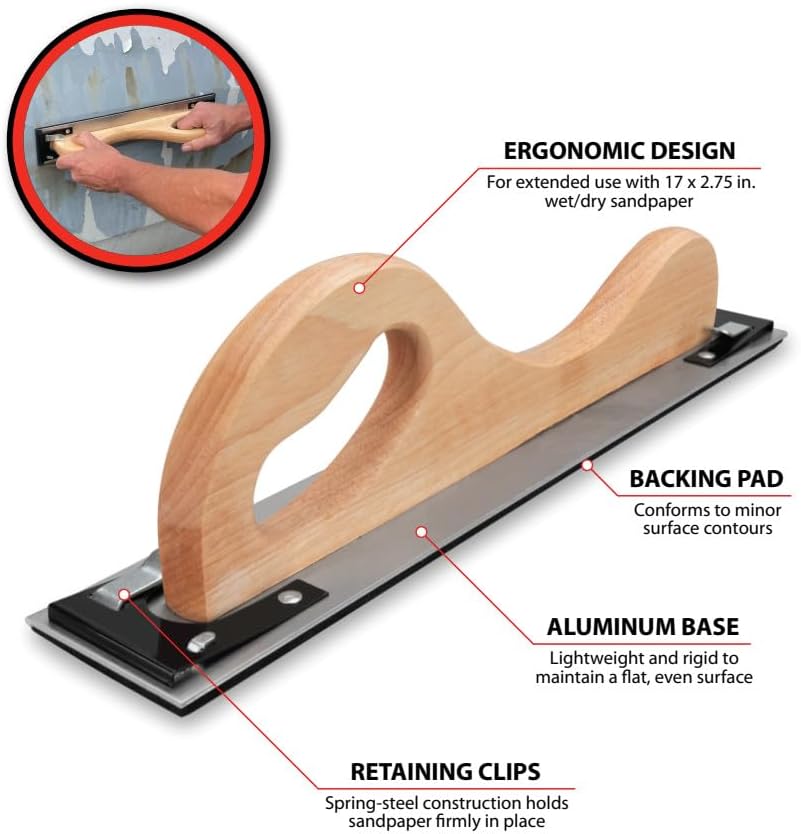 The Performance Tool W3060 17 inch Wood Handle Longboard Rigid Sander is a versatile tool suitable for a variety of sanding tasks. Its lightweight aluminum base ensures a flat, even surface with minimal effort. The rounded wooden handle provides comfort during extended use, while the high-density EVA foam backing pad conforms to minor surface contours for efficient sanding. With dual spring-steel retaining clips, it securely holds sandpaper in place. This sander is compatible with 17 x 2.75 in. (432 x 70 mm) wet/dry sandpaper.