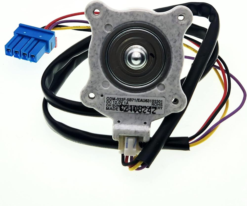 • The EAU63103301 Refrigerator Condenser Fan Motor has electrical specifications of DC 12V and 1A and has a 4-pin connector, Shaft Length: 23mm, Shaft diameter: 3mm Line length: 64cm 25in