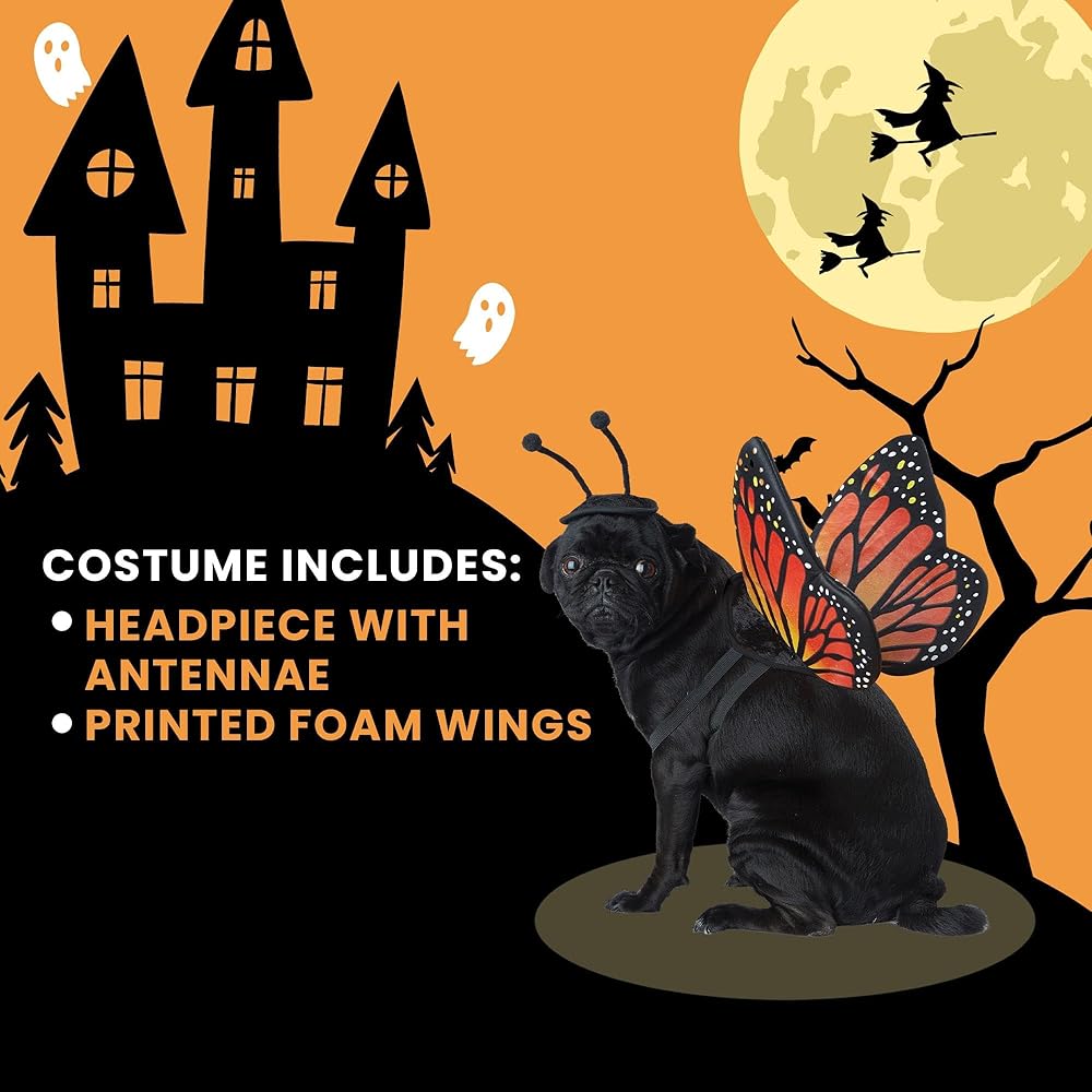 Your furry pal will emerge as a beautiful butterfly. Butterfly costume includes antennae, head piece and foam monarch butterfly wings.