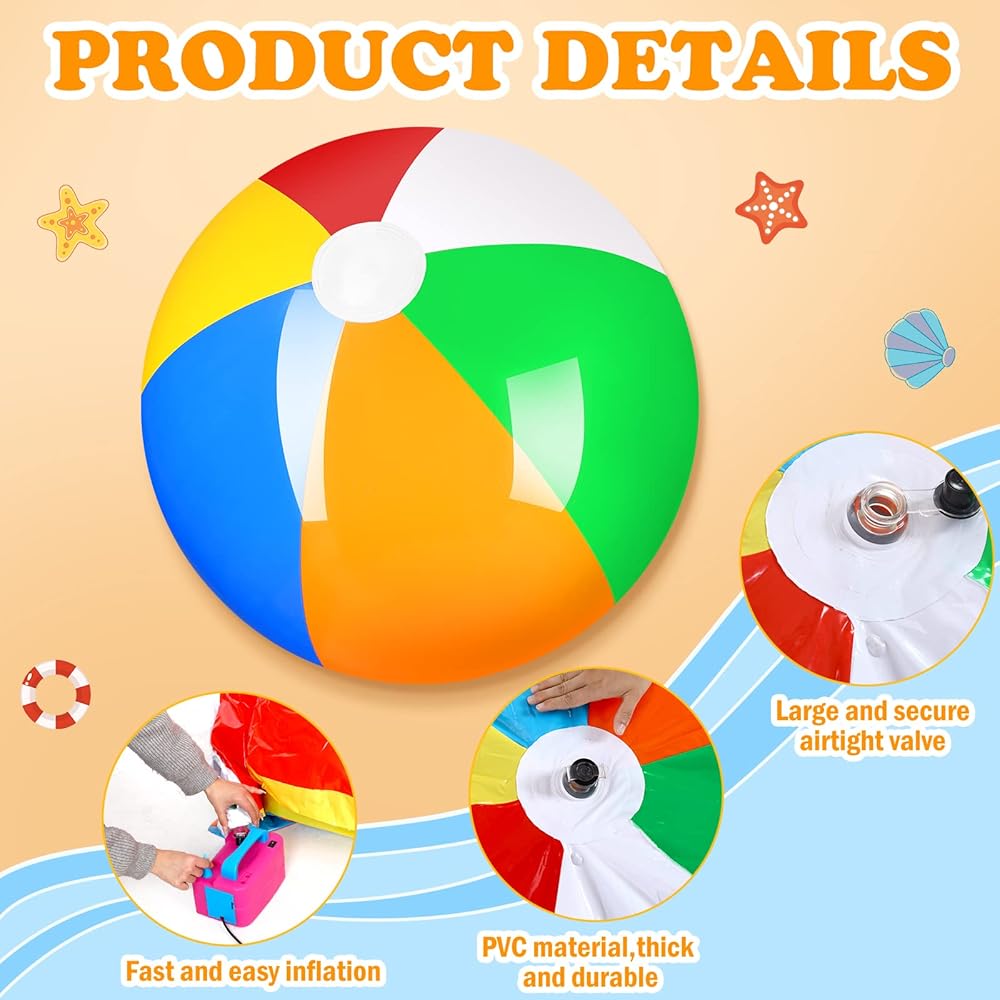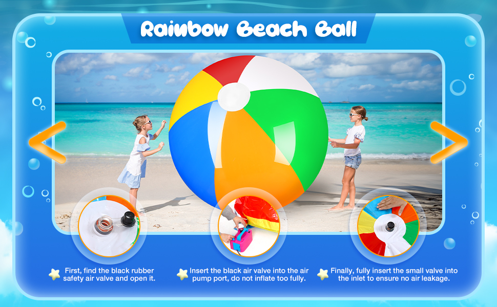 سهلة النفخ: تتميز كرات الشاطئ بألوان قوس قزح هذه بنظام صمام سريع يسهل نفخه؛ عندما تحصل على كرات الشاطئ القابلة للنفخ، يمكنك استخدام مضخة أو إخراج ما يكفي من الهواء بداخلها، ثم يمكنك اللعب بكرات الشاطئ الخاصة بحمام السباحة؛ افتح الصمام، ثم اضغط على الهواء المتبقي لتفريغه بعد اللعب به