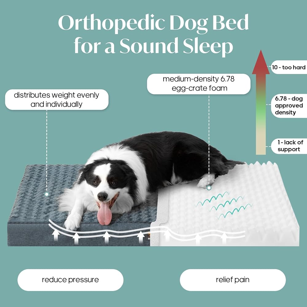 Orthopedic Support: The orthopedic dog bed is padded with medium firm egg-crate foam, which distributes weight evenly and individually, offers stress-free support, reduces pressure points and properly aligns the spine. After a sound sleep in the medium orthopedic dog bed, the dog will wake up refreshed and energized.