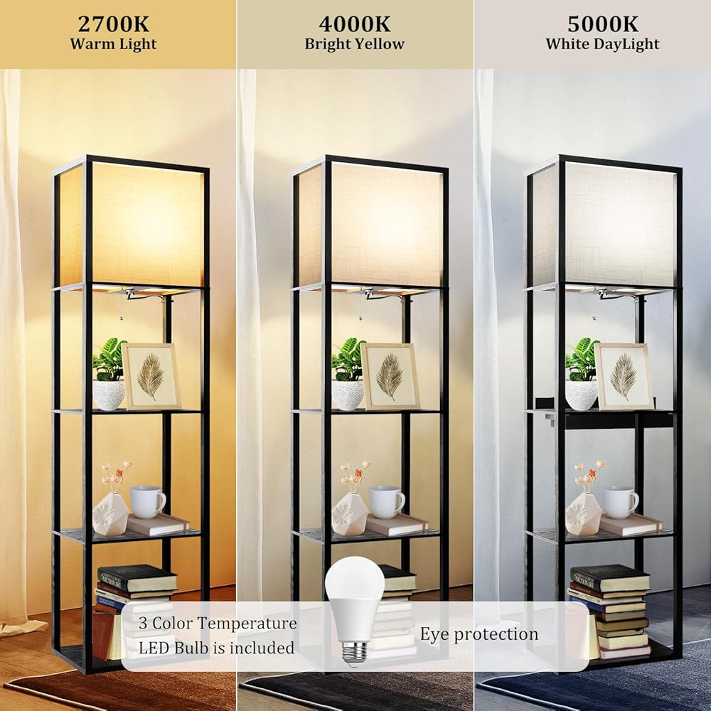 مصباح أرضي واسع AVV مع أرفف، مصباح أرضي حديث على الرف 4 طبقات، لمبة LED 15 وات مع 2700 4000 ك 5000 ك لون يمكن اختياره، مصباح عرض لغرفة المعيشة وغرفة النوم والمكتب، أسود