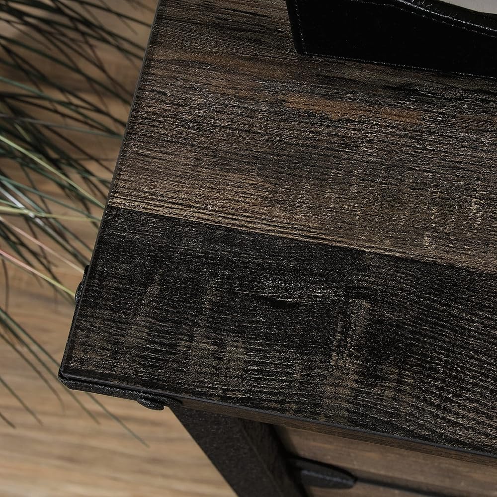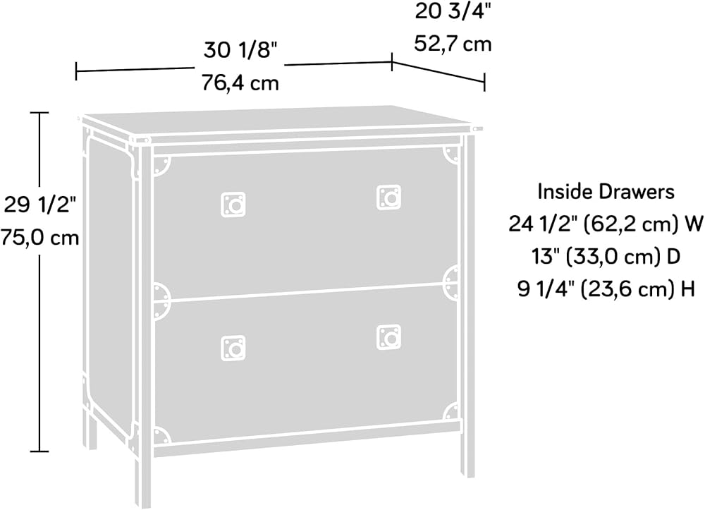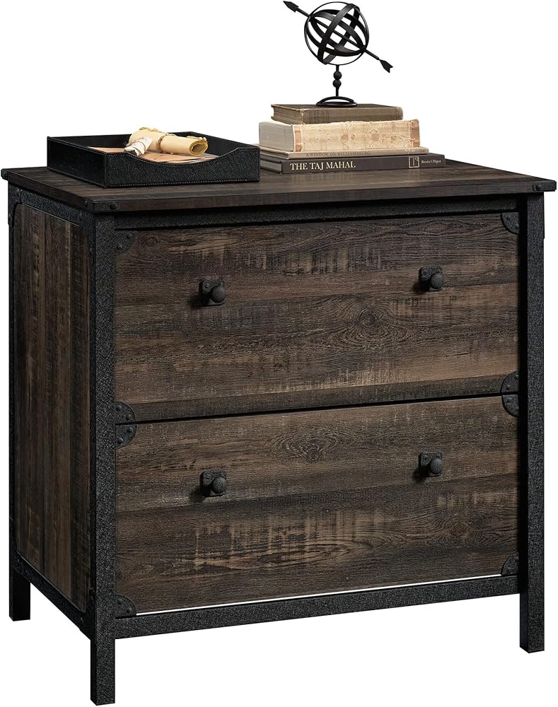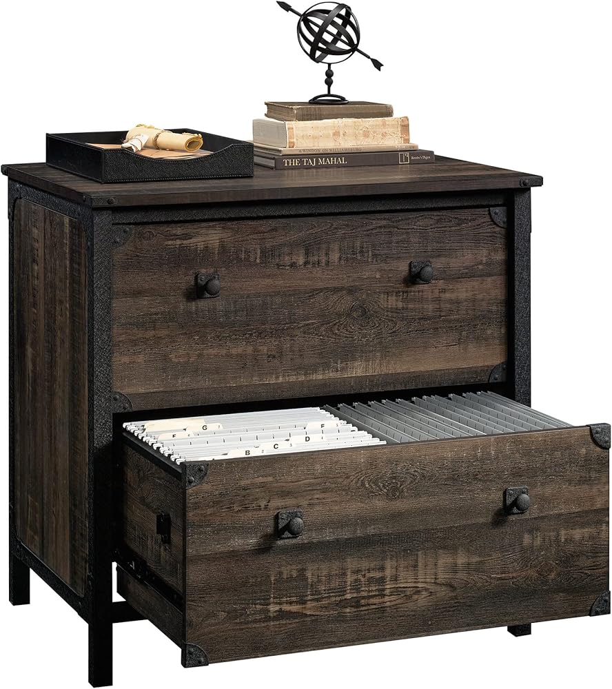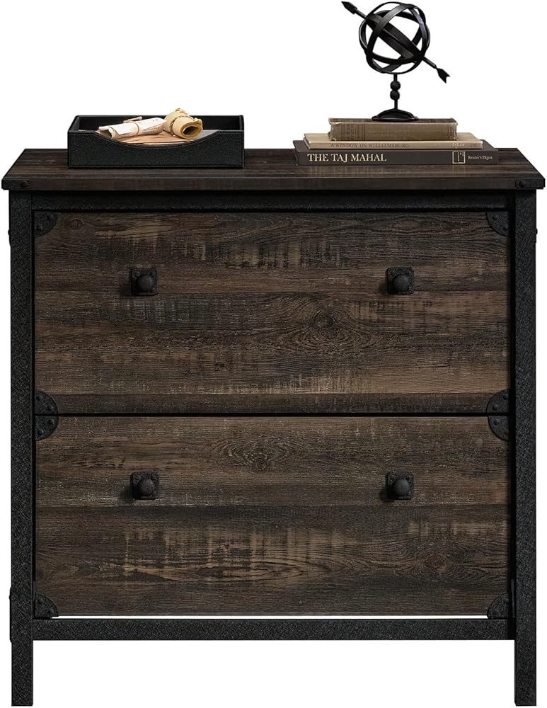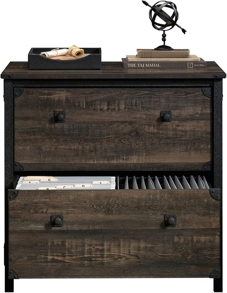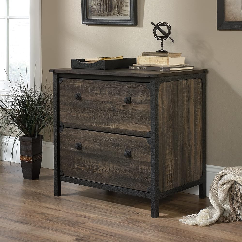 Keep your office or workspace organized and in style with this handsome lateral file from the Steel River® collection. This 2-drawer lateral file cabinet features two spacious file drawers that opens and close on smooth full extension slides. Each drawer accommodates letter or legal-size hanging files so you can keep all your important files and papers organized and easily accessible. This lateral file also includes an interlocking safety mechanism that only allows one drawer to open at a time. A textured, powder coated metal frame and corner metal accents are the charming touches of design that make this wood lateral file cabinet stand out. This industrial file cabinet is finished on all sides for versatile placement in any room of your home and looks great from any angle. Finished in Carbon Oak®, this simply stunning wood file cabinet with metal framing adds style and functionality to your office or workspace.