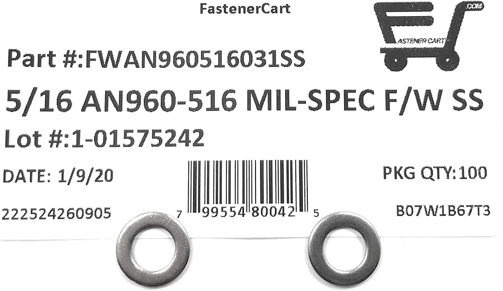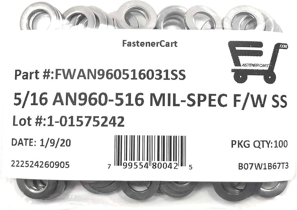 غسالات مسطحة 5/16 بوصة AN960-516 Mil-Spec مصنوعة من الفولاذ المقاوم للصدأ AN960-516 (5/16 ID x 9/16 OD x.062 THK) 100 قطعة