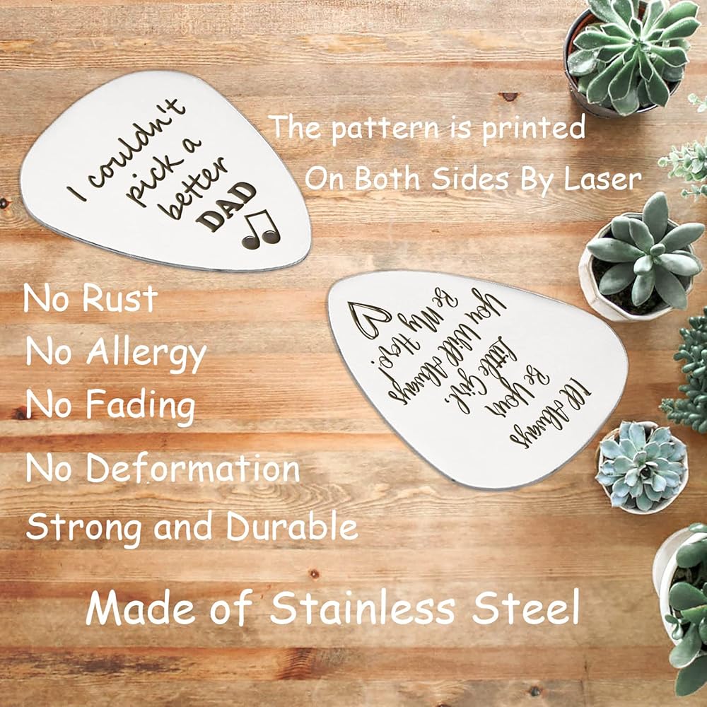 Exquisite Design:It's a hard metal with excellent engravings. Lovely message for him, Our creative pattern is printed on both sides of the stainless steel guitar pick by laser.The writing are neat, smooth edgings, and the weight that's comfortable to hold in your hand. Show your lover with this lovely gift, and show how much he means to you.