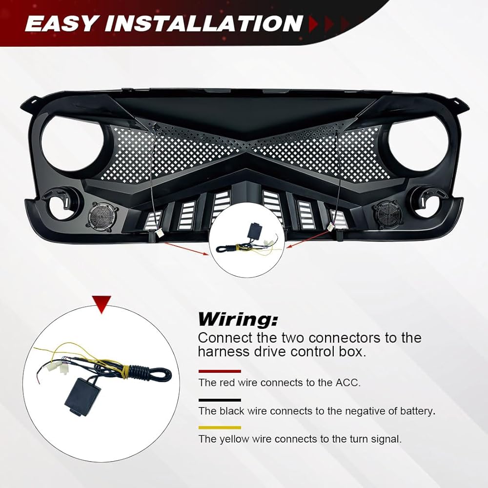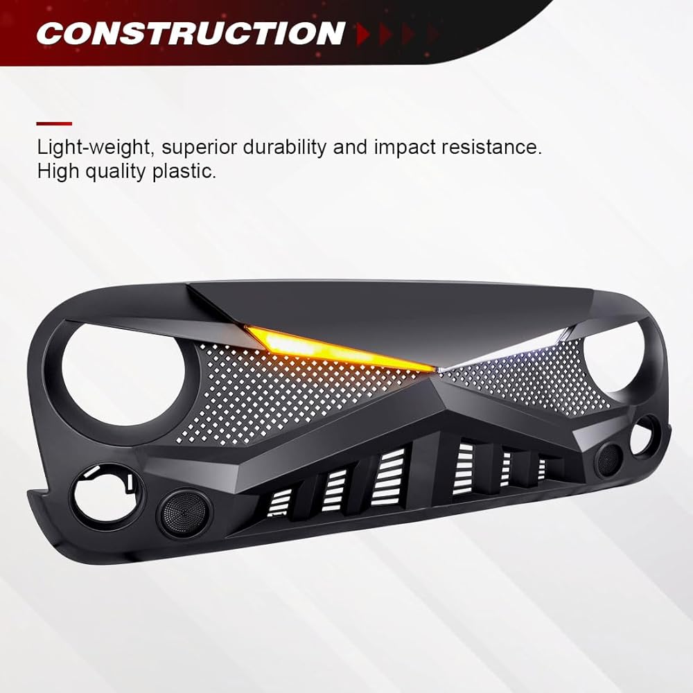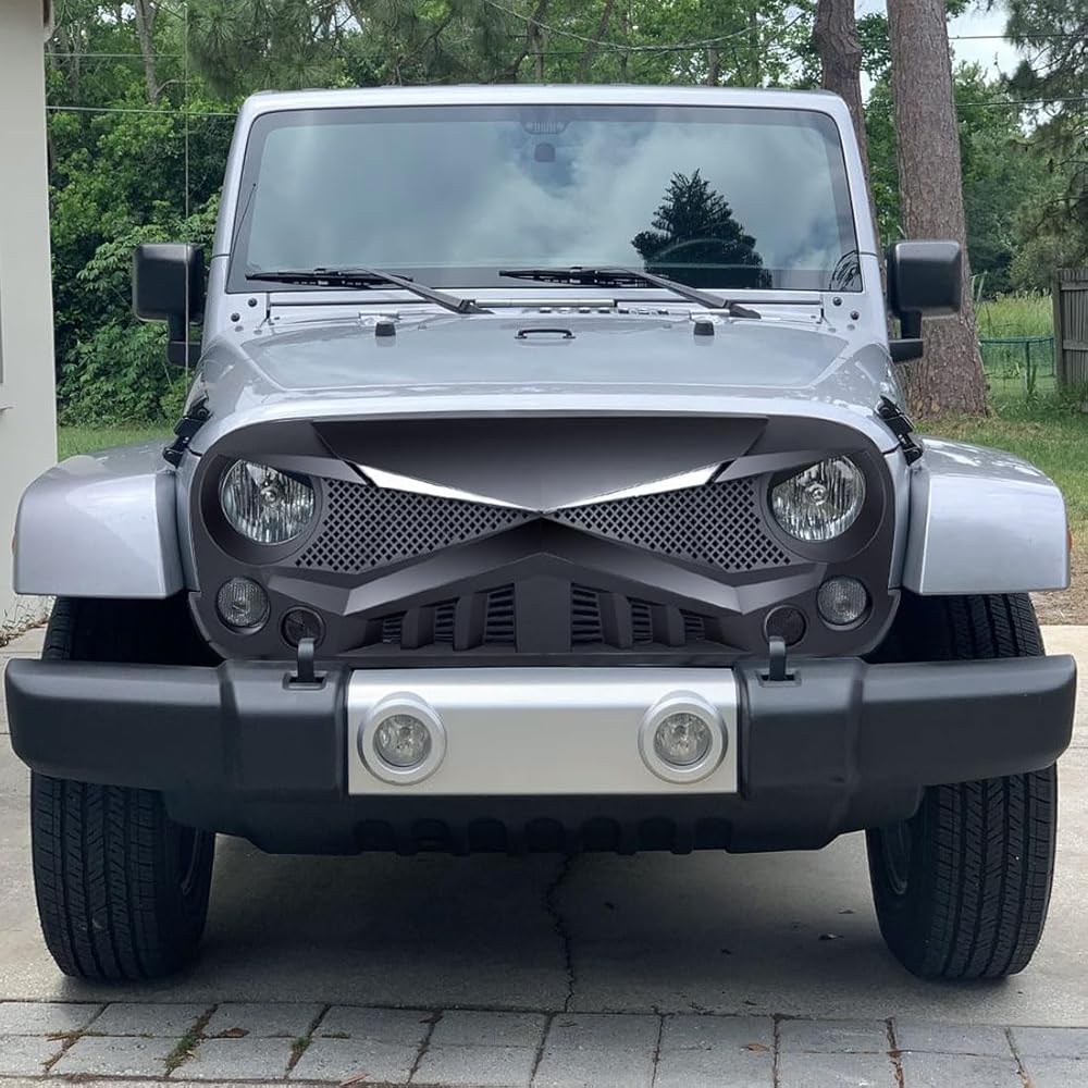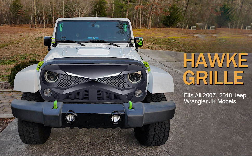 شواية أمامية متوافقة مع 2007-2018 Jeep Wrangler JK/JKU، شبكة Hawke مع مصابيح إشارة الانعطاف DRL، أسود غير لامع