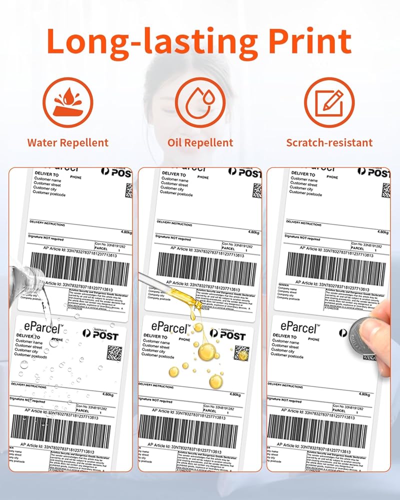 [متينة] طبقة عالية الجودة مقاومة للماء والزيوت تجعل ملصقات الشحن الخاصة بك تدوم طويلاً. تسمح الملصقات عالية اللزوجة لملصقات الشحن الخاصة بك بالالتصاق بقوة بالكرتون الخاص بك.