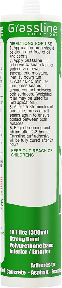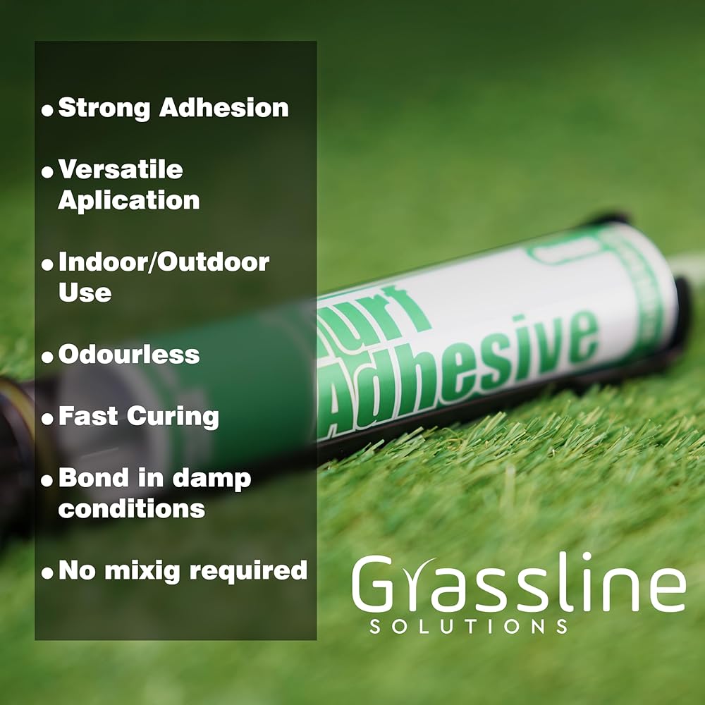 Artificial Turf Adhesive in vibrant green, engineered with unbeatable strength and eco-friendliness in mind. This single-part adhesive boasts a fast-curing formula, ensuring hassle-free application designed for versatility, our adhesive is suitable for both indoor and outdoor use, providing excellent adhesion and durability in any environment. Its fast-curing formula sets within 2-3 hours, expediting project completion, while full curing occurs within 24 hours for maximum strength and longevity. Rest assured, our adhesive is engineered to withstand the elements, including UV exposure, temperature fluctuations, and heavy rain, ensuring reliable performance over time. While it provides a permanent bond for your artificial turf, its strong adhesion properties ensure a secure installation. Elevate your turf installation projects with confidence, knowing you're choosing a product that prioritizes durability, sustainability, and convenience.