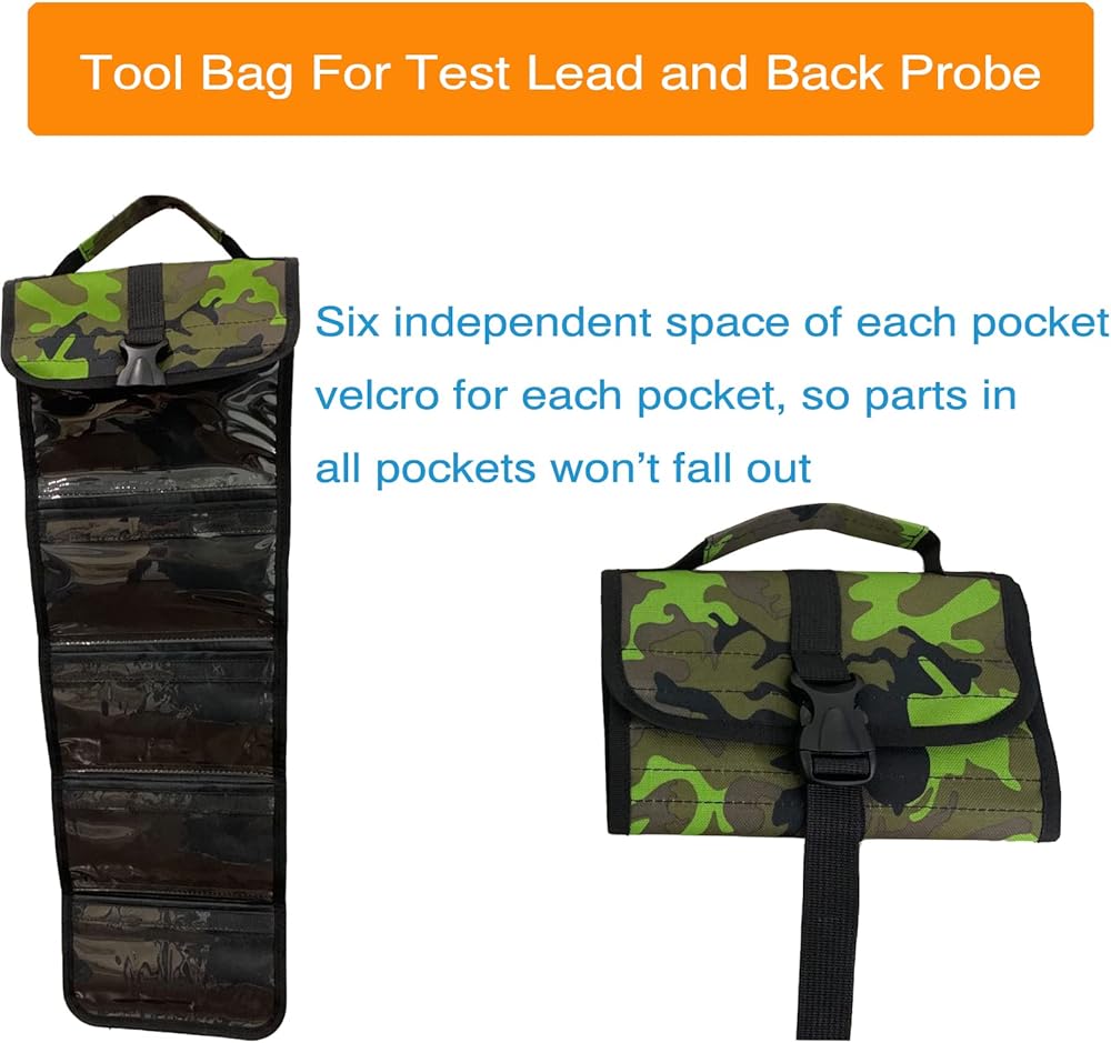 【KEEP ALL YOUR TOOLS ORGANIZED】Black carrying case and 6-pocket roll up tool bag to organize your tools such as test lead and lest probes to keep everyone organized.