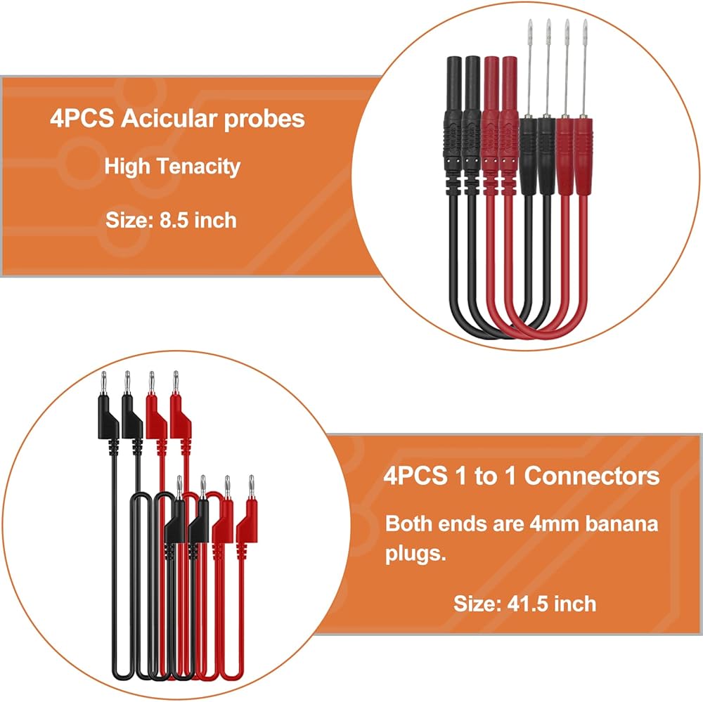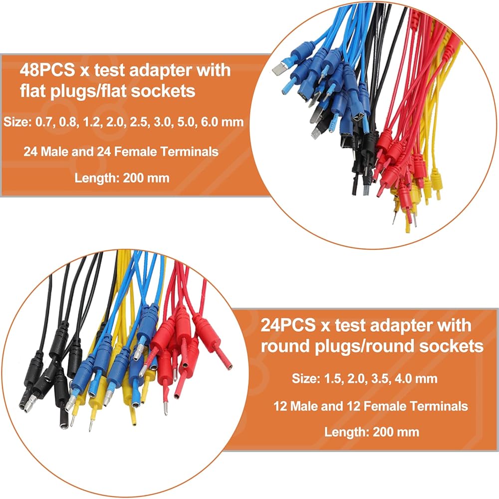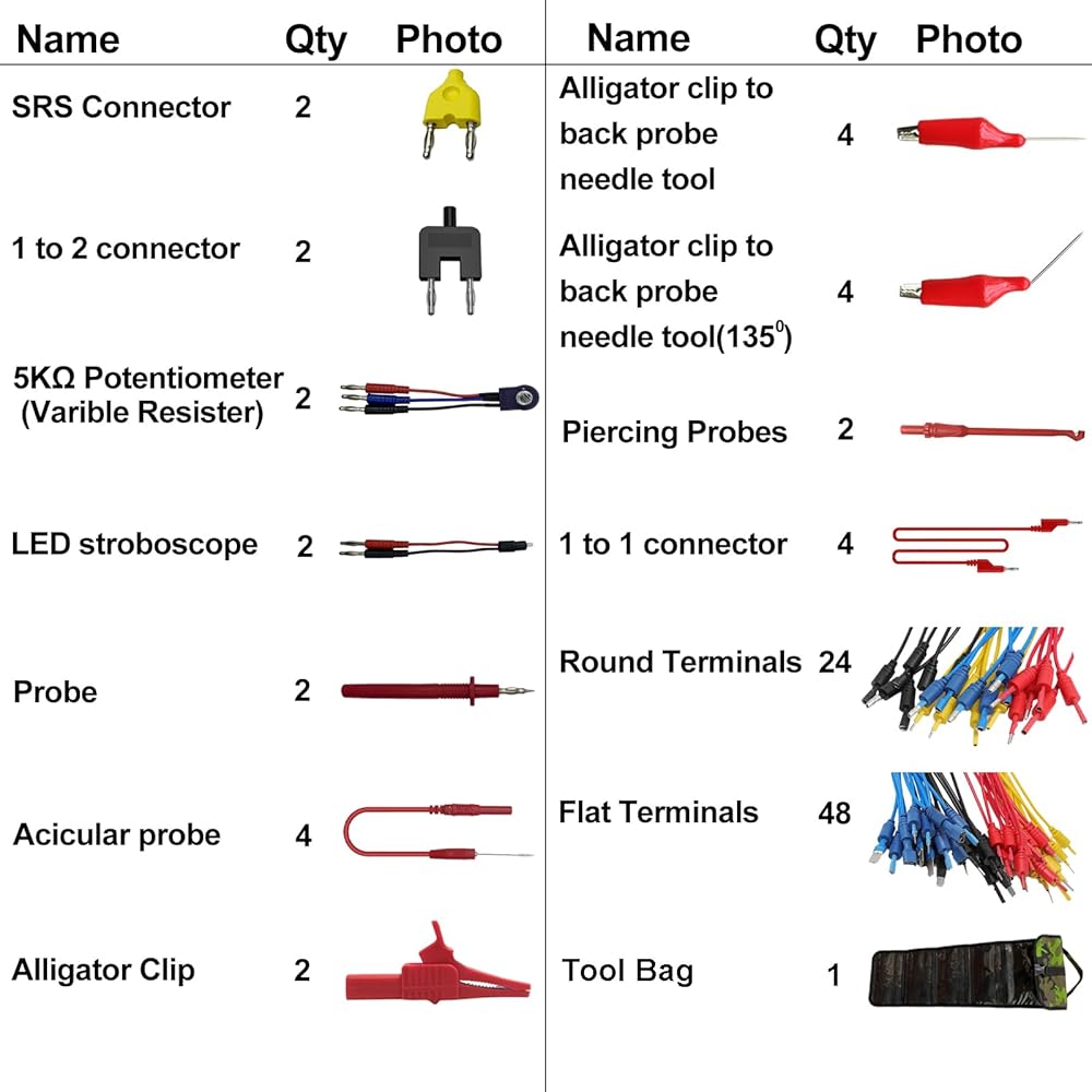 【Updated 93-in-1】1 x Black carrying case; 1 x 6 pockets roll up tool bag; 72 x Terminals (48 flat terminals and 24 round terminals); 2 x LED stroboscope; 2 x standard probes; 2 x alligator clips ; 4 x acicular probes; 2 x SRS connector; 2 x potentiometer (5KOhm); 4x 1-to-1 connector; 2x 1-to-2 connector.
