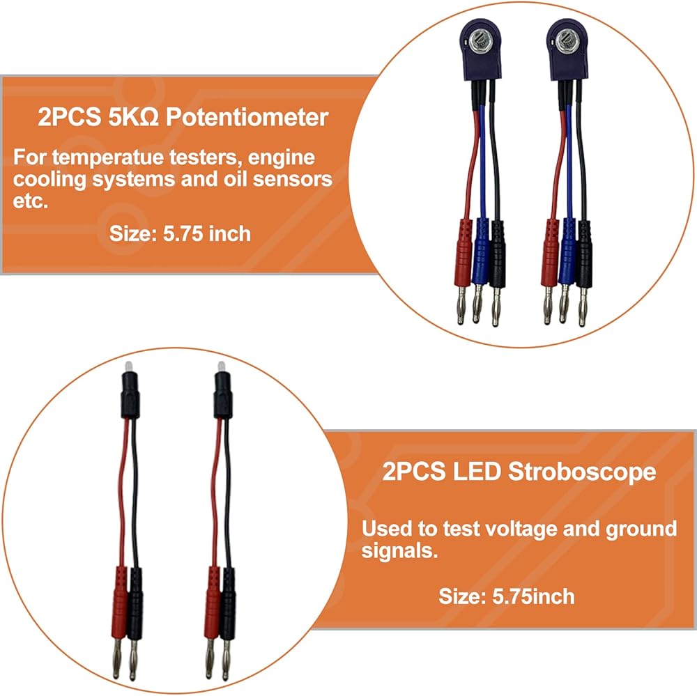 【SRS Connector】Test Lead Kit can be used to monitor Hall sensors, fuel injectors, solenoid valves, etc. SRS connector provided can simulate air bag and routed contracting device of safety belt to avoid accident or miss-judgment.