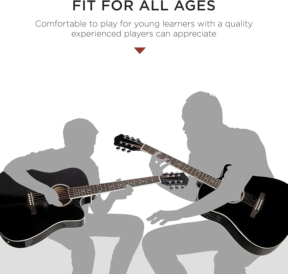 EASY TO PLAY: This acoustic-electric is comfortable to hold, with a cutaway shape that allows you to more comfortably reach past the neck and hit higher notes on the fretboard; OVERALL DIMENSIONS: 40.5"(L) x 15.5"(W) x 4.5"(H); Guitar Weight: 4.6 lbs.