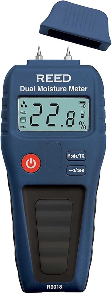 This dual function moisture meter is capable of detecting moisture in wood and building materials by pin or by running the instrument over the surface area (non-destructive method). the R6018 displays icons to indicate low, medium or high levels of moisture and an audible alert that increases in frequency as detected moisture level rises.