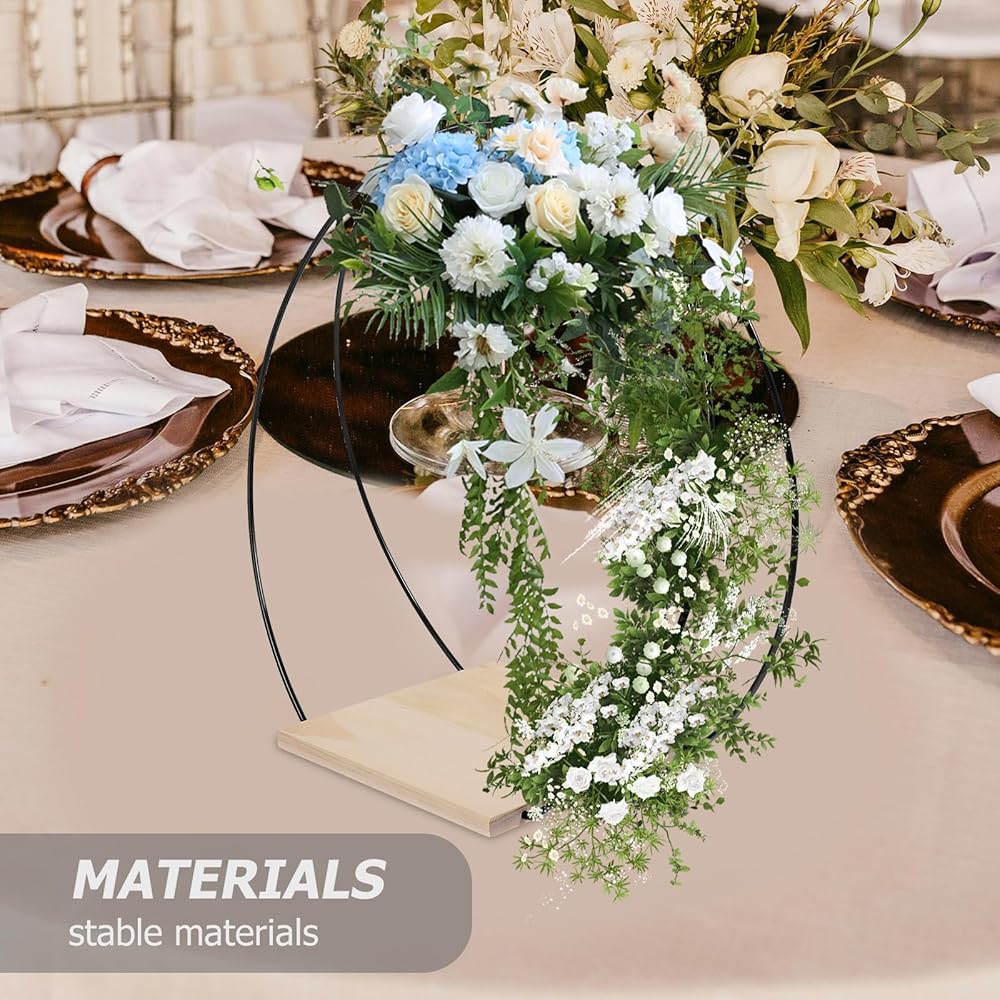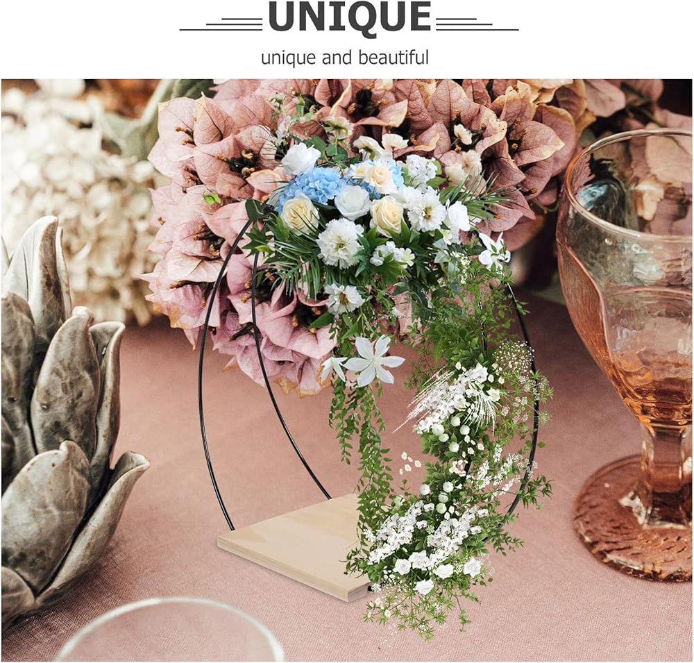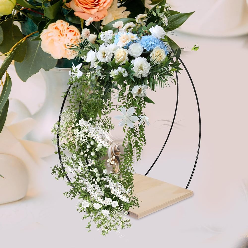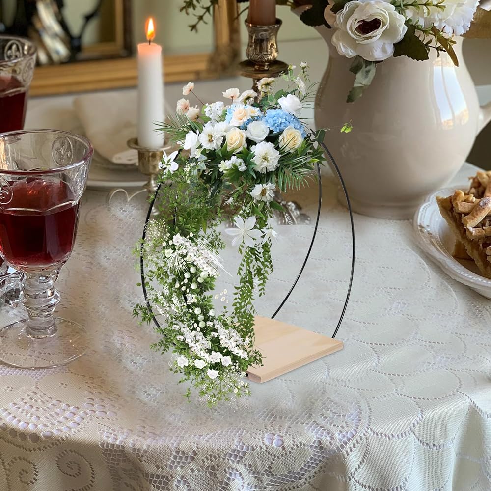 ☀ قطعة مركزية على شكل حلقة إكليل من الزهور المعدنية مع حامل خشبي، إكليل زهور من الزهور DIY، طوق مكرامية لحفلات الزفاف وعيد الحب وديكور الحرف اليدوية، مصنوعة من مادة حديدية قوية وقوية، حلقة الزهور المصنوعة يدويًا متينة ويمكن أن تدوم لفترة طويلة وقت.