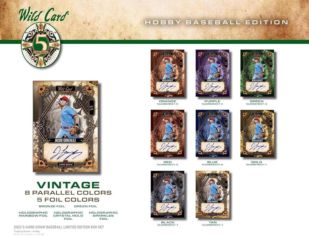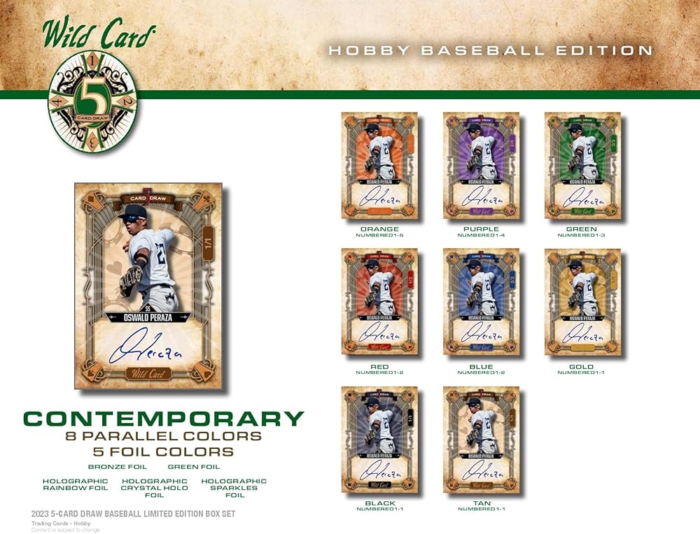 Box Break: - 1 Autograph #'d to 5 - 1 Autograph #'d to 4 - 1 Autograph #'d to 3 - 1 Autograph #'d to 2 - 1 Autograph #'d to 1 Parallels: - Orange #'d to 5 - Purple #'d to 4 - Green #'d to 3 - Red #'d to 3 - Blue #'d to 2 - Gold #'d to 1 - Black #'d to 1 - Tan #'d to 1 Foils: - Bronze - Green - Holographic Rainbow - Holographic Crystal Holo - Holographic Sparkles
