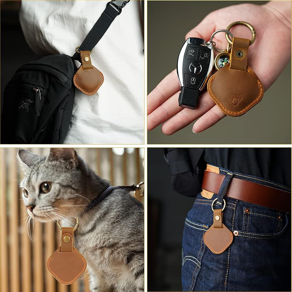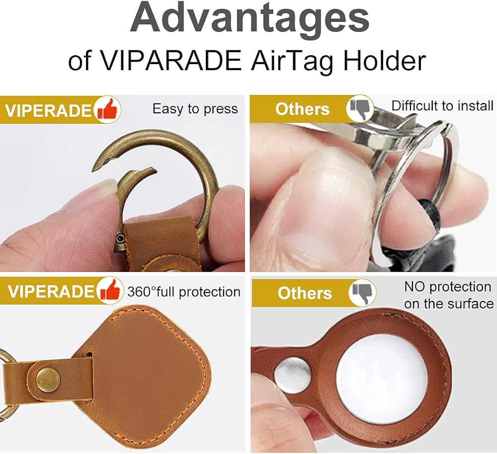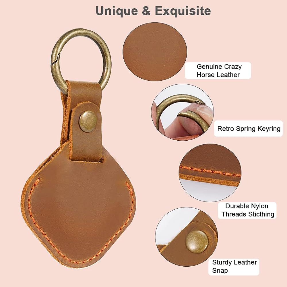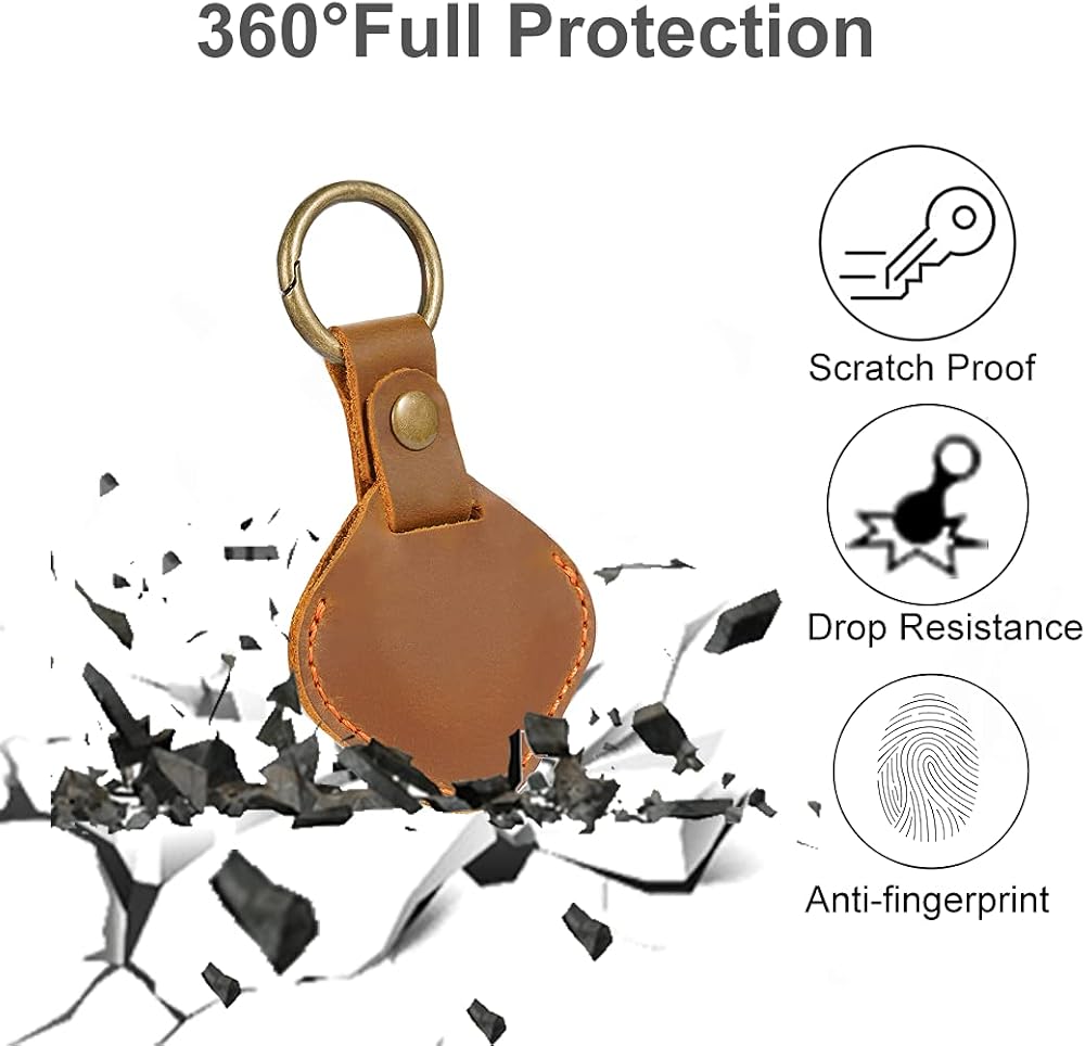 ☺ حلقة مفاتيح AirTag ذات حماية كاملة 360 درجة -- بعد إجراء أبحاث سوقية متعمقة، اخترنا تصميم الحماية الكاملة. بالمقارنة مع الجرابات الجلدية المجوفة الأخرى، فإن تصميمنا الجلدي المغلق بالكامل يتميز بوظيفة مقاومة الخدش والصدمات. كما أن الجزء النحاسي قوي جدًا وليس من السهل كسره، ولن يسقط جهاز AirTag الخاص بك.