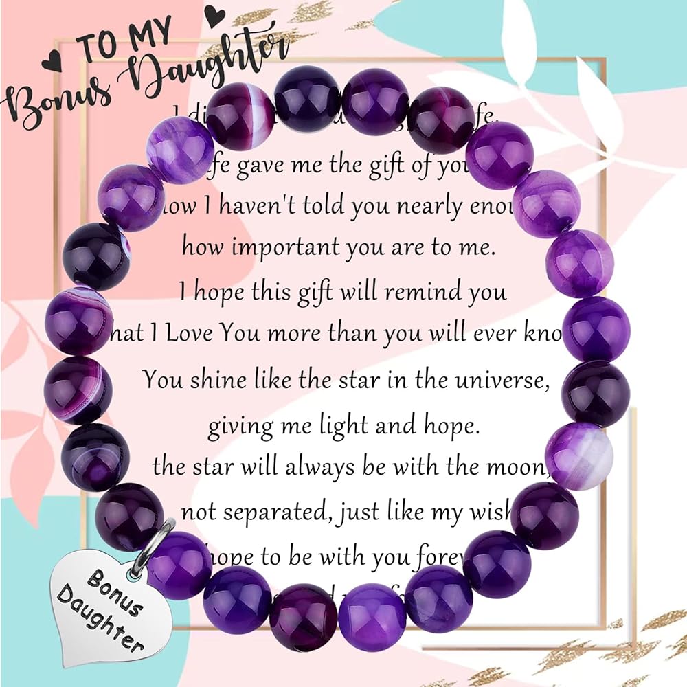 إلى ابنتي الإضافية: أنا لم أعطيك هدية الحياة، بل الحياة أعطتني هدية منك. أعلم أنني لم أخبرك بما فيه الكفاية عن مدى أهميتك بالنسبة لي. آمل أن تذكرك هذه الهدية بأنني أحبك أكثر مما ستعرفه على الإطلاق! والدك الإضافي المذهل أو والدتك الإضافية المذهلة. هذا سوار جميل لابنتك مع تذكير دائم لابنتك الإضافية بمدى دعمك وحبك لها.