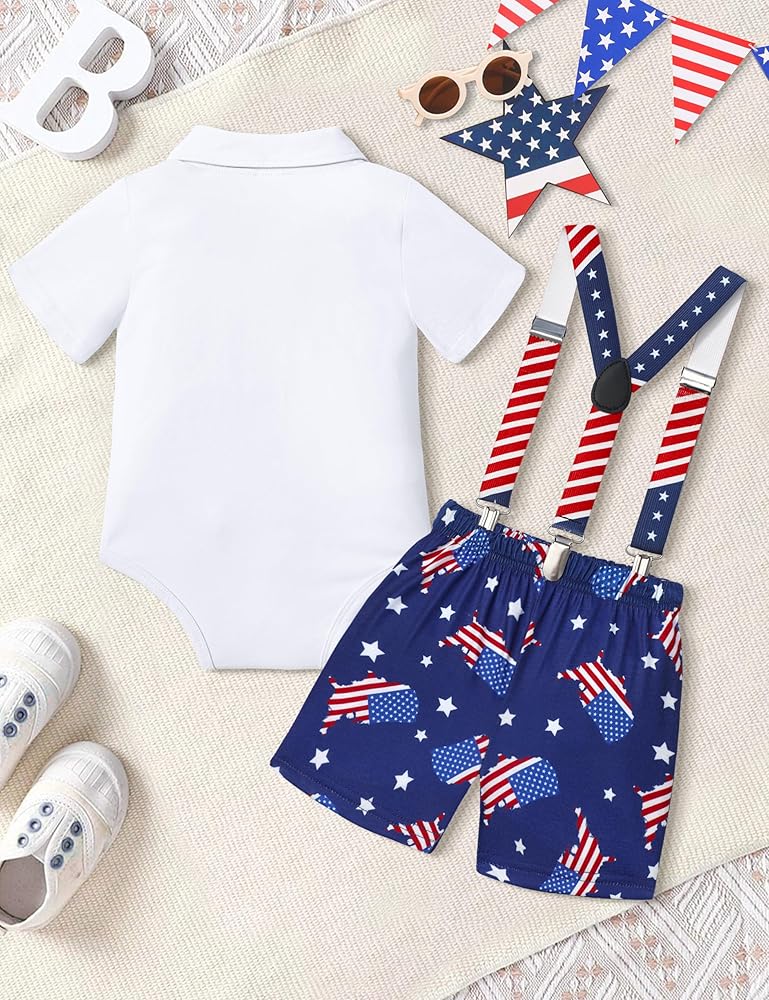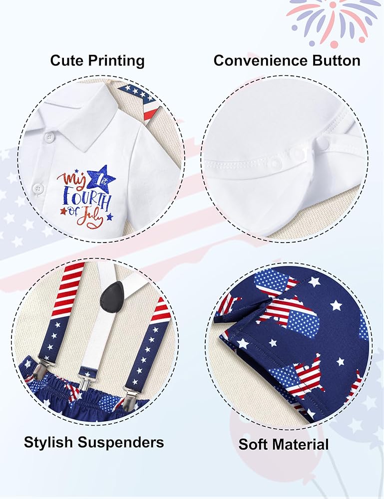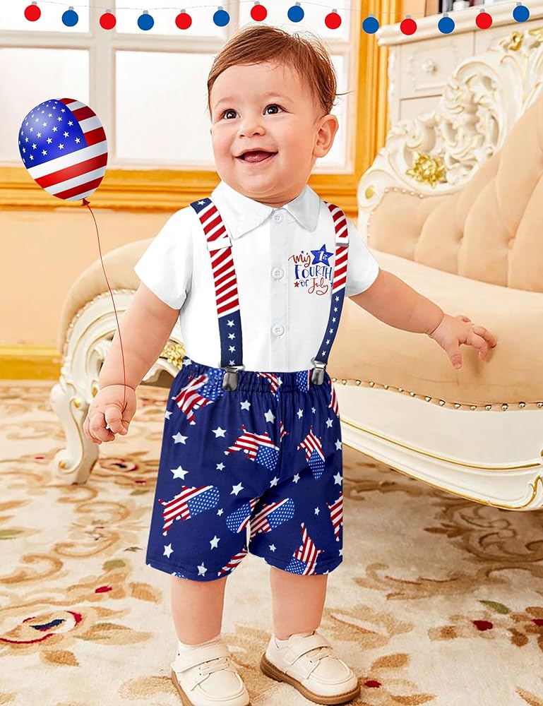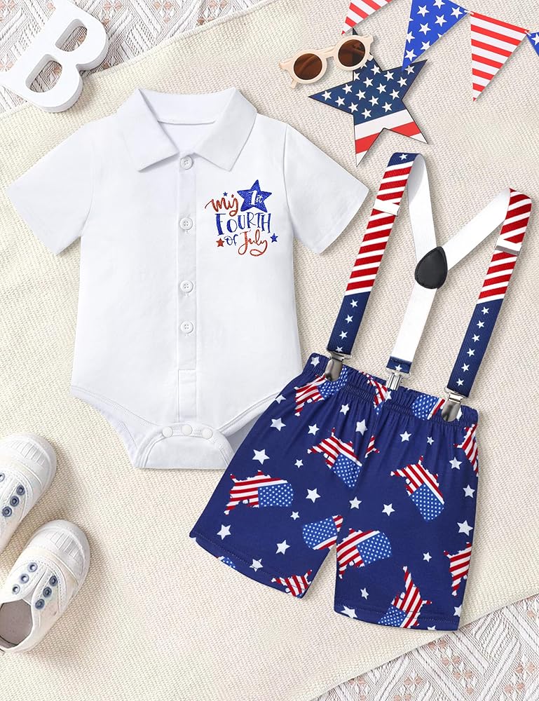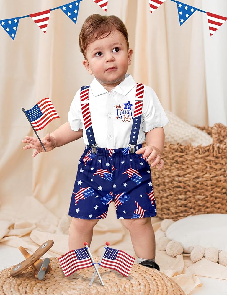 • 🗽【تصميم فريد】زي طفل رضيع في الرابع من يوليو، قميص قصير الأكمام مع طباعة حروف "My 1st فورث يوليو"، شورت بحمالات بنمط العلم الأمريكي ونجمة، هذا هو الزي المثالي لطفلك الوطني