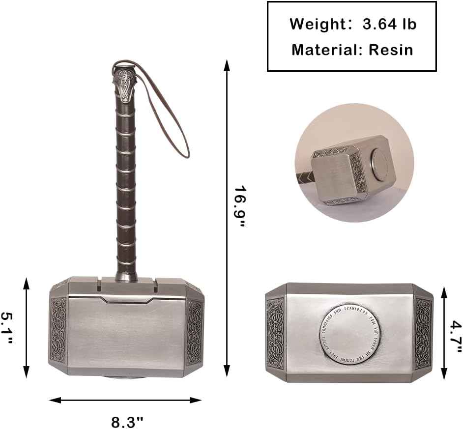 【Introduction】 Resin Hammer with Lightable Plastic Base【Specification】Total Length:16.9"/ Total Width: 8.3"/ Handle Length: 11.8"/ Weight:3.64 lb 【Material】The hammer is made of resin, durable and full of details. A plastic lightable base is included in the package. You just need to install the battery to the base (no battery included) and turn on the switch to get a great display. 【Application】Perfect for Collection,Cosplay,Gifts 【After-Sales】If you have any questions about the product you received, please feel free to contact us. We will get back to you within 24 hours