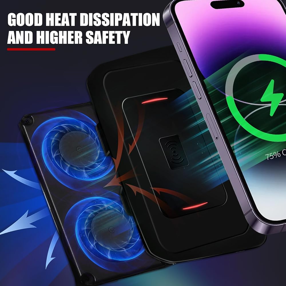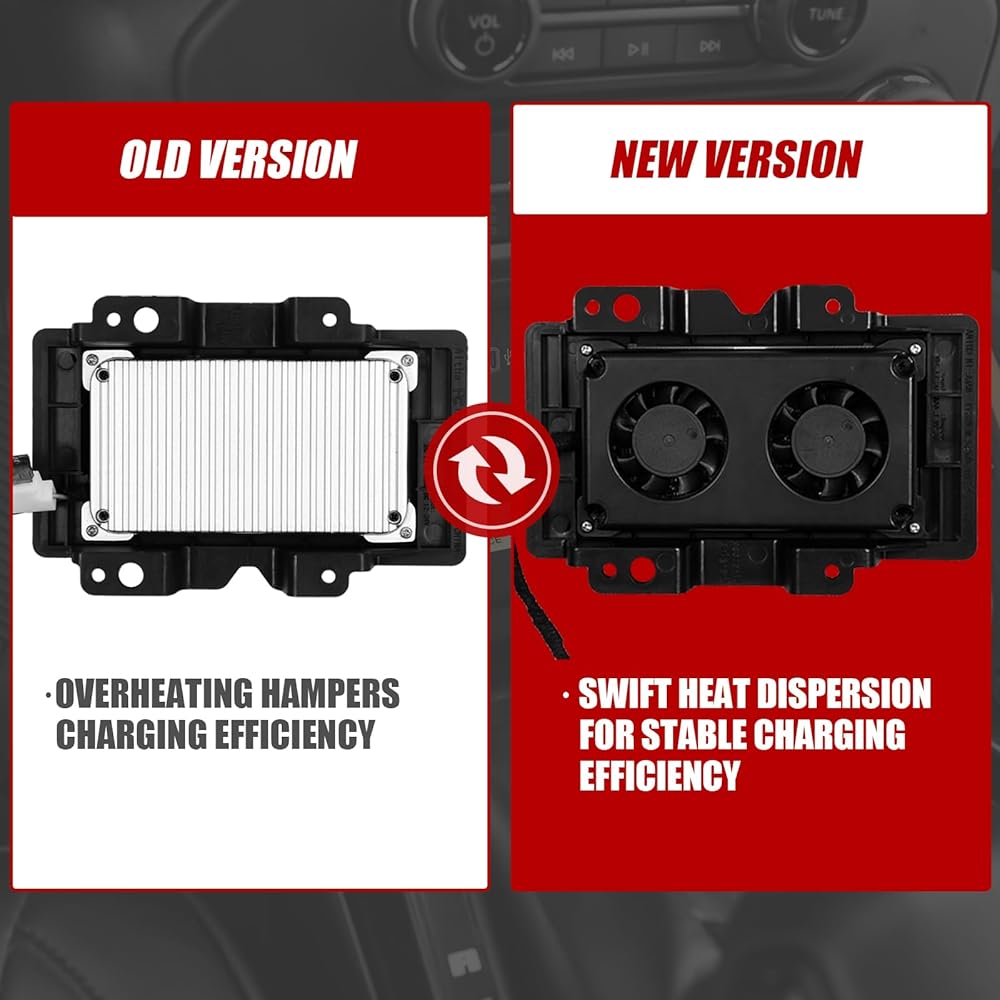 • تبريد مروحة الهواء: لوحة الشحن اللاسلكية معتمدة من لجنة الاتصالات الفيدرالية (FCC) لجودة من الدرجة الأولى. يتميز الإصدار المطور بالتبريد بمروحتين لتبديد الحرارة بشكل ممتاز، والحفاظ على طاقة مستقرة ومنع الحماية من الحرارة الزائدة.