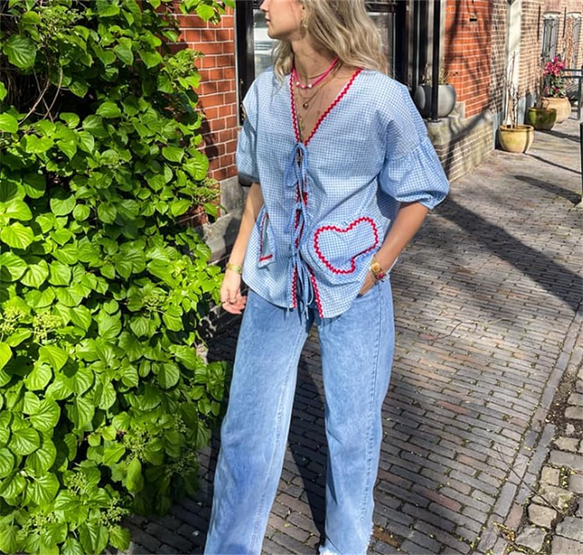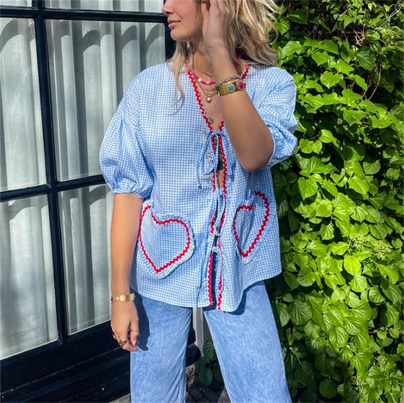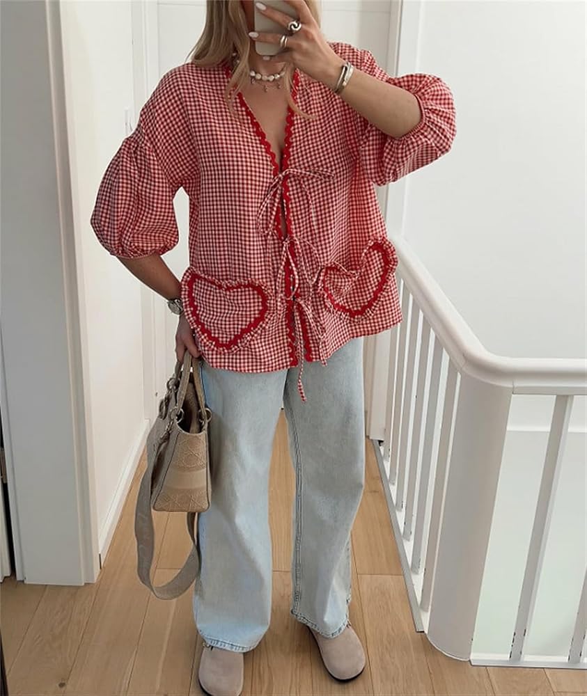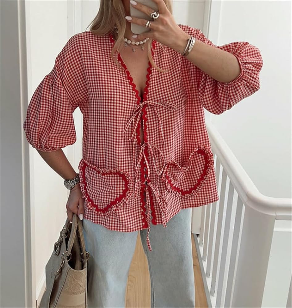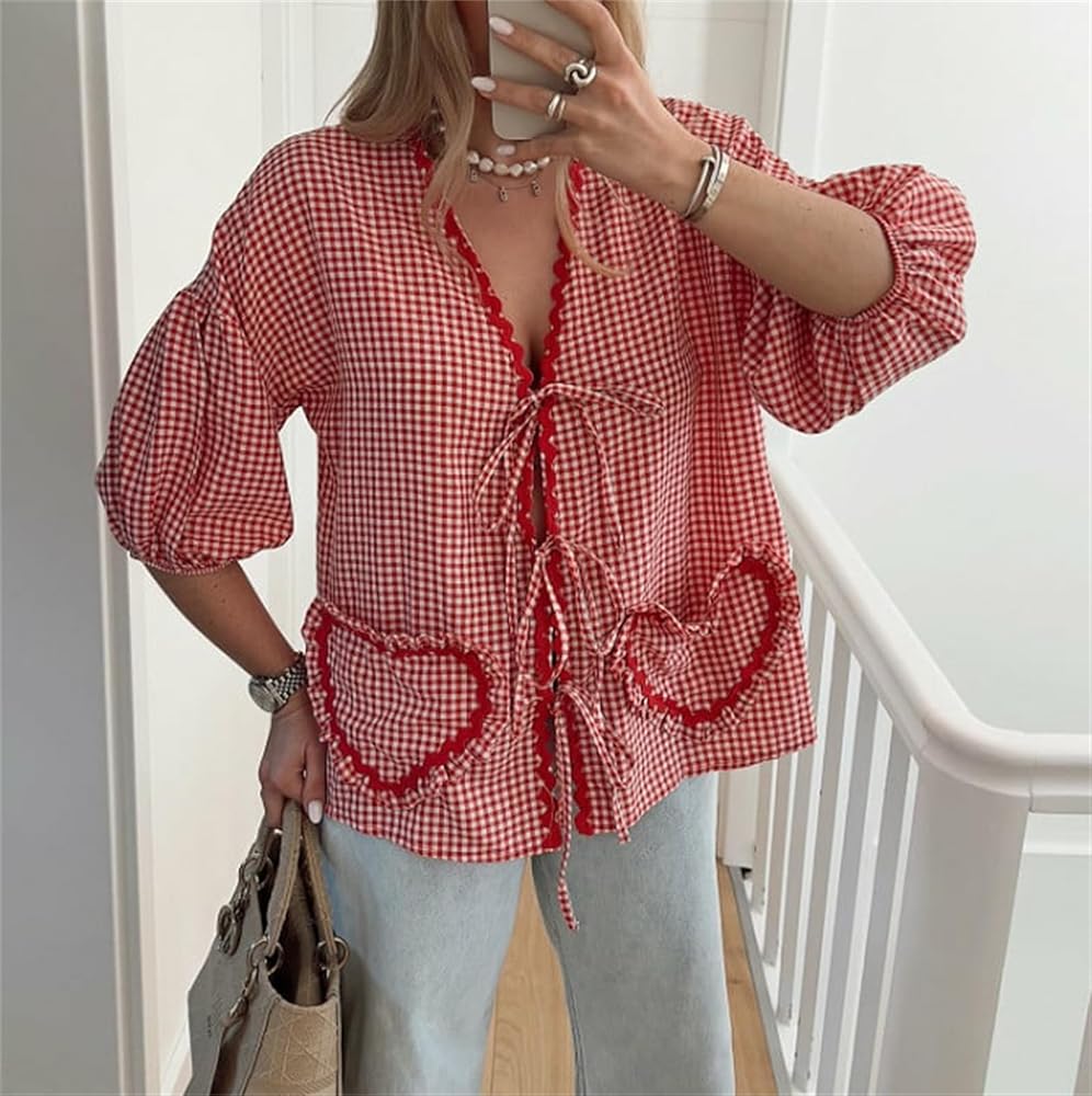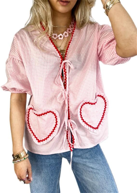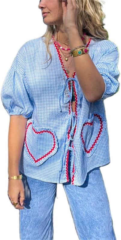 التصميم: قميص نسائي لطيف على شكل بيبلوم، قميص نسائي برباط أمامي، قميص نسائي منقوش، قميص نسائي بأكمام منتفخة، تصميم مطرز على شكل قلب لطيف، أكمام قصيرة، قميص بأكمام فقاعية، رقبة على شكل حرف V، قميص برباط، قميص صيفي لطيف Y2k لطيف و ساحرة للارتداء.