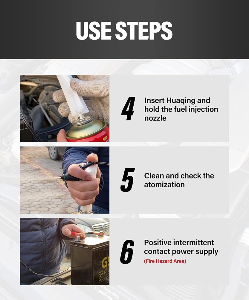[Working Principle] The electrical port of the fuel injector is connected to a 12V power supply through this terminal and cable. When the current is turned on, the solenoid valve in the fuel injector opens. At the same time, the liquid pressure in the detergent bottle is sprayed out through a white pipe joint, and then cleaned through a nozzle.