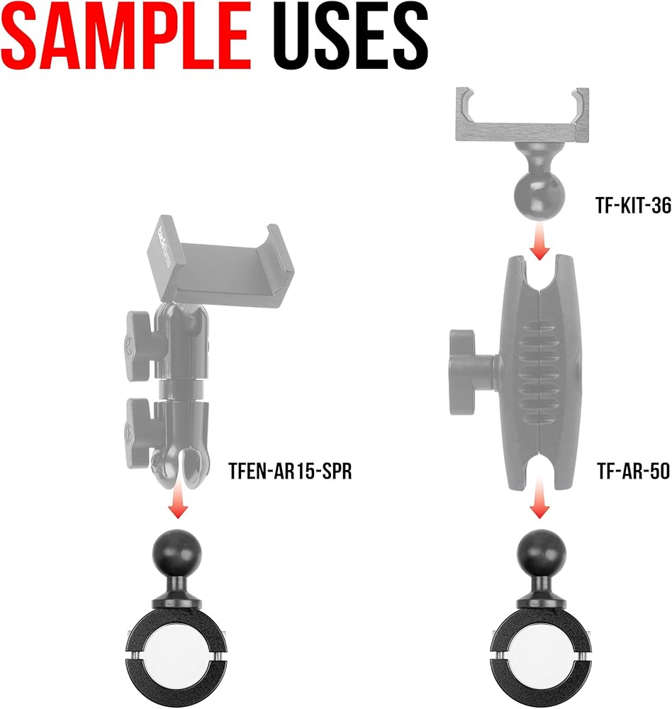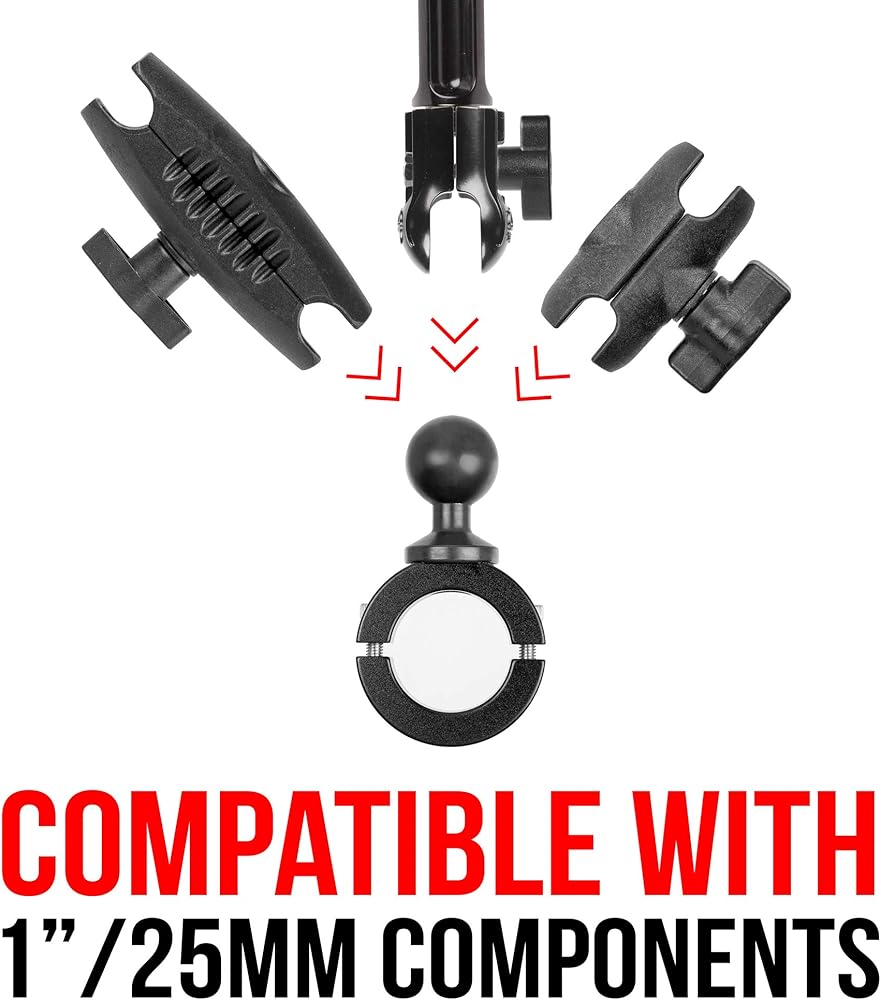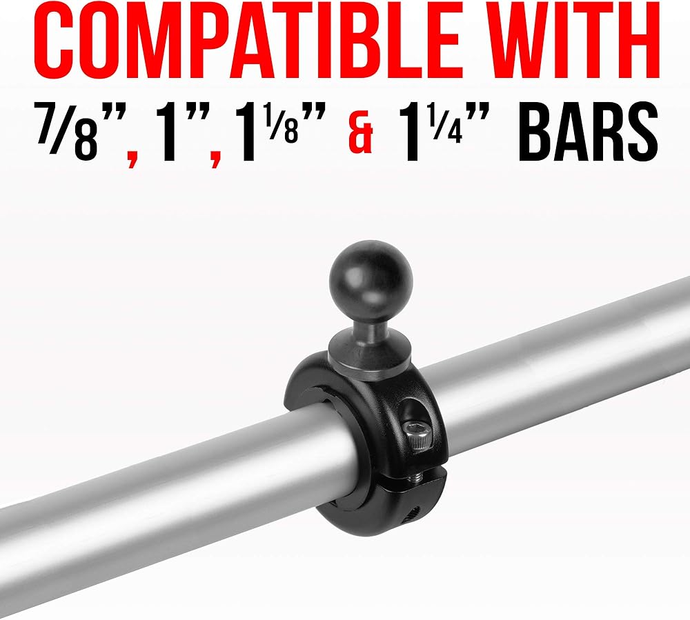حامل على قضيب الدراجة النارية مع كرة مقاس 1 بوصة. هيكل معدني مع طلاء مطاطي على الكرة. متوافق مع ذاكرة الوصول العشوائي وأنظمة الكرة مقاس 1 بوصة من Arkon وiBolt والمزيد. سلسلة المؤسسة Tackform.